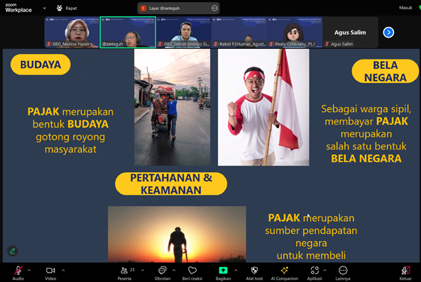 “Saya sangat mengapresiasi kesediaan Bapak Ibu yang telah mendukung serta menyukseskan implementasi program Inklusi Kesadaran Pajak pada Pendidikan Tinggi. Saya mengucapkan terima kasih yang sebesar-besarnya kepada Bapak Ibu dosen yang ke depannya berkenan untuk berkontribusi dalam peningkatan kesadaran dan pemahaman pajak peserta didik di lingkungan kampus masing-masing,” tuturnya.