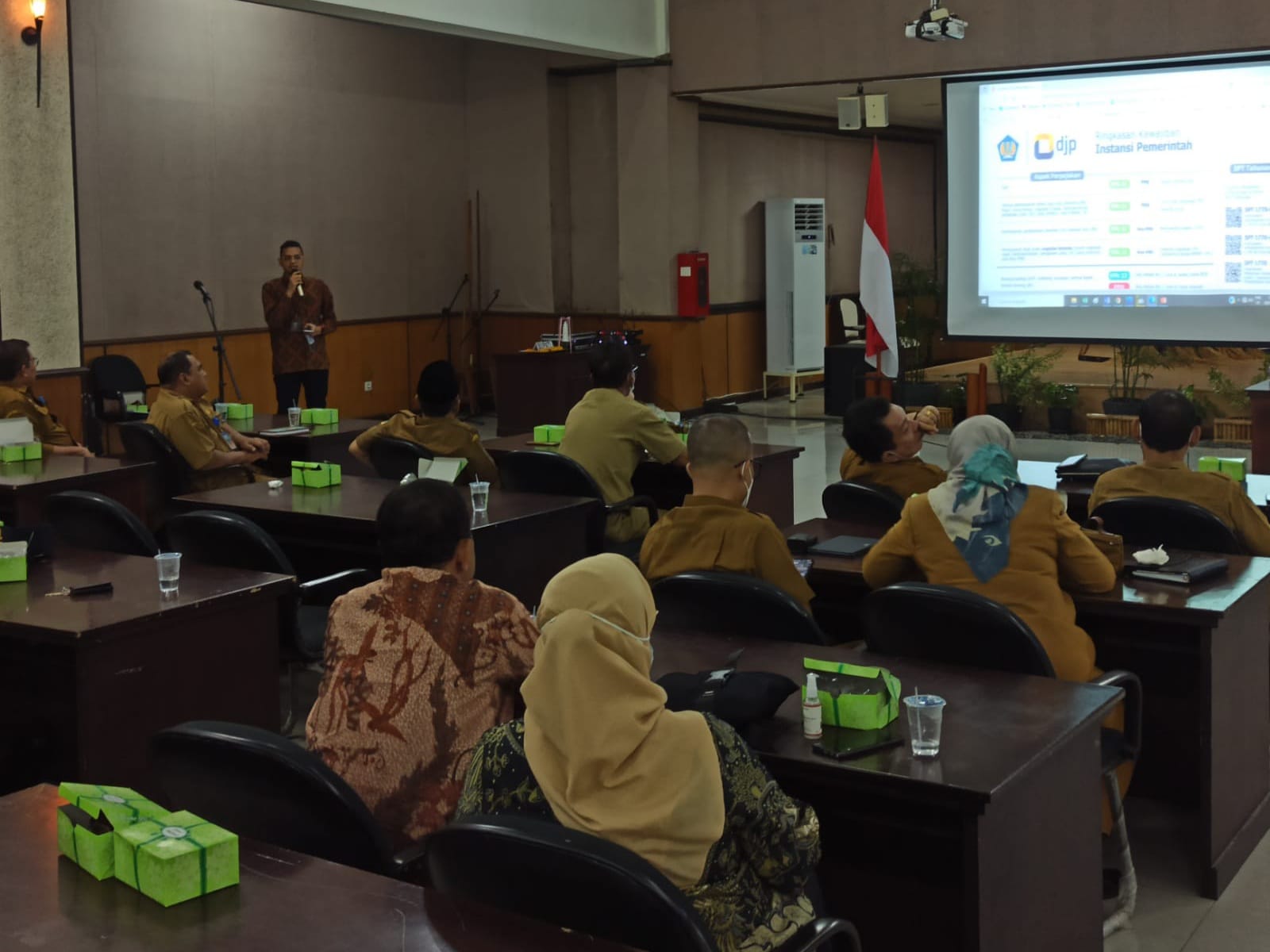 Penyuluh pajak ahli pertama Ahmad Zainul Bahar Noor menyampaikan poin-poin perubahan tatacara administrasi pemotongan dan pemungutan pajak dalam hal transaksi pengadaan barang dan jasa lembaga pemerintah yang diantaranya adalah tentang penggunaan aplikasi elektronik bukti potong (e-bupot).