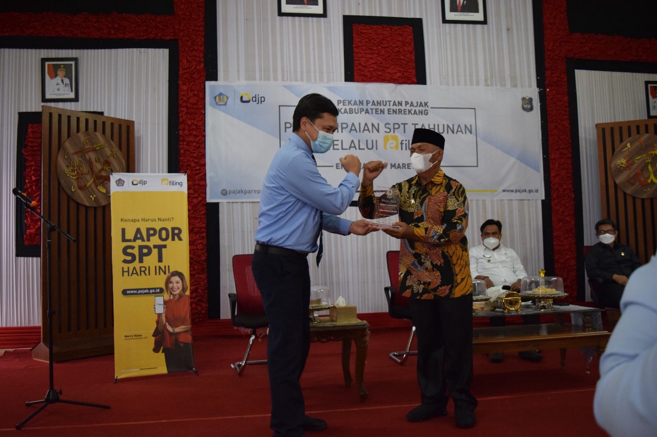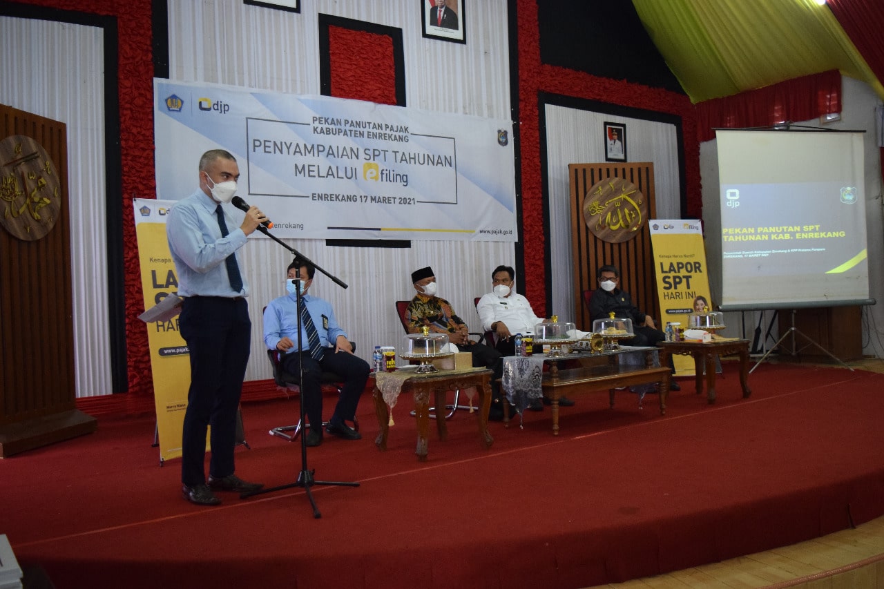 Kantor Pelayanan, Penyuluhan, dan Konsultasi Perpajakan (KP2KP) Enrekang bekerja sama dengan KPP Pratama Parepare melaksanakan kegiatan Pekan Panutan SPT Tahunan bersama pejabat publik di aula Rumah Jabatan Bupati Enrekang, Enrekang, Sulawesi Selatan (Rabu, 17/3). Kegiatan ini dihadiri langsung oleh Bupati Enrekang Muslimin Bando dan Wakil Bupati Enrekang Asman serta Kepala Organisasi Perangkat Daerah (OPD) Kabupaten Enrekang.