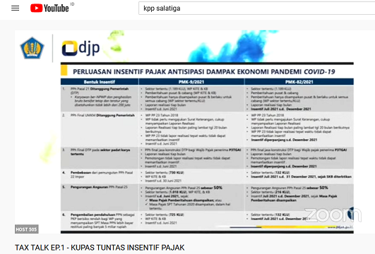 Kantor Pelayanan Pajak (KPP) Pratama Salatiga melaksanakan kegiatan Tax Talk di ruang penyuluh lantai 2 Kantor Pelayanan Pajak (KPP) Pratama Salatiga melalui Youtube Live dan Aplikasi Zoom Meeting dengan mengusung tema “Kupas Tuntas Insentif Pajak, Manfaatkan Insentifnya, Laporkan Realisasinya!” di Salatiga (Jumat, 30/7).