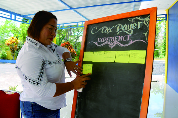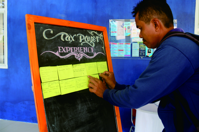 Kertas yang sudah berisi penilaian dapat wajib pajak tempelkan di papan Tax Payer Experience yang terletak di dekat pintu masuk. Wajib pajak yang memberi penilaian di papan Tax Payer Experience, akan mendapatkan suvenir, sehingga wajib pajak dengan antusias memberikan penilaian terhadap pelayanan KP2KP Talaud.