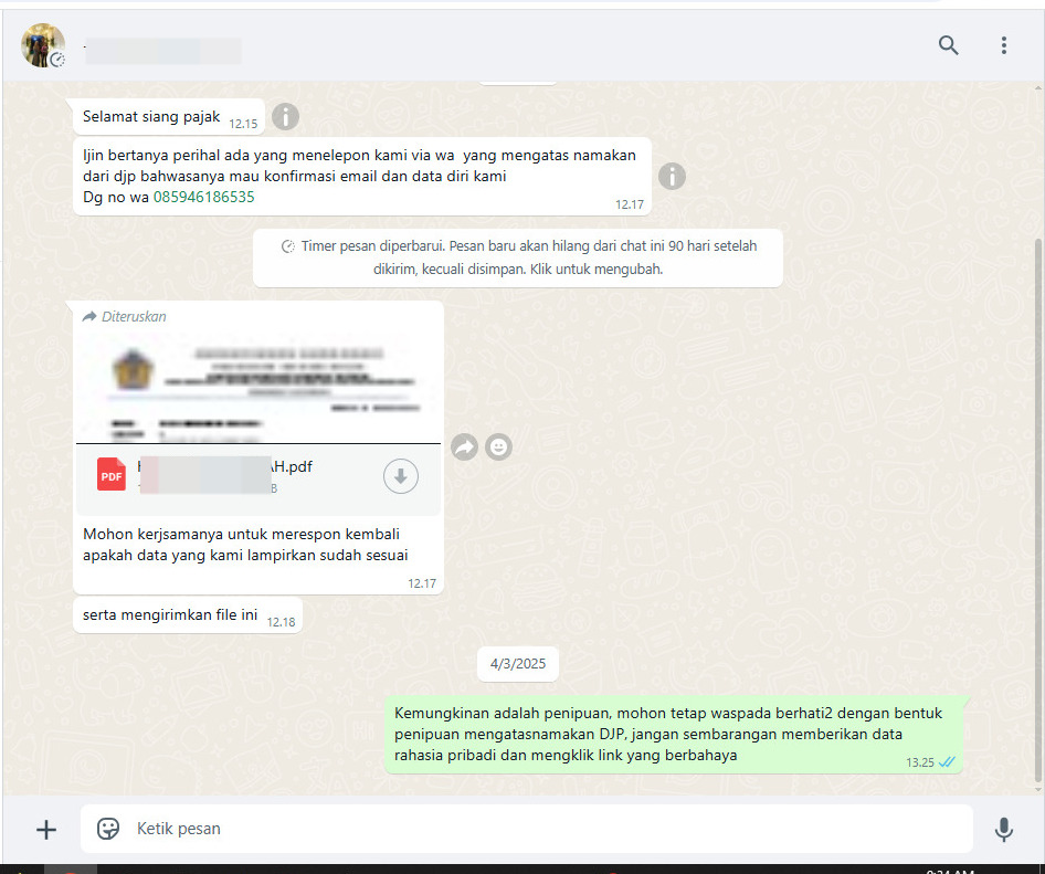 Laporan penipuan mengatasnamakan DJP diberikan oleh Pujianto, selaku wajib pajak yang mempunyai badan usaha, melaui WhatsApp (WA) ke nomor pelayanan KP2KP Bandarjaya. Dalam pesannya, Pujianto menyampaikan bahwa menerima pesan melalui WA dari pihak yang mengatasnamakan DJP. Pihak tersebut meminta konfimasi data pribadi dan data badan usaha, dan mengirimkan file mencurigakan dalam bentuk Portable Document Format (.pdf). Sebelum menghubungi melalui WA, oknum penipu juga menghubungi Pujianto melalui panggilan telepon. Pujianto menjelaskan bahwa pesan tersebut mencurigakan dan berbahaya, kemudian Ia memilih untuk melaporkannya ke KP2KP Bandarjaya. Tindakan Pujianto dirasa tepat dan KP2KP Bandarjaya memberikan apresiasi kepada Pujianto.