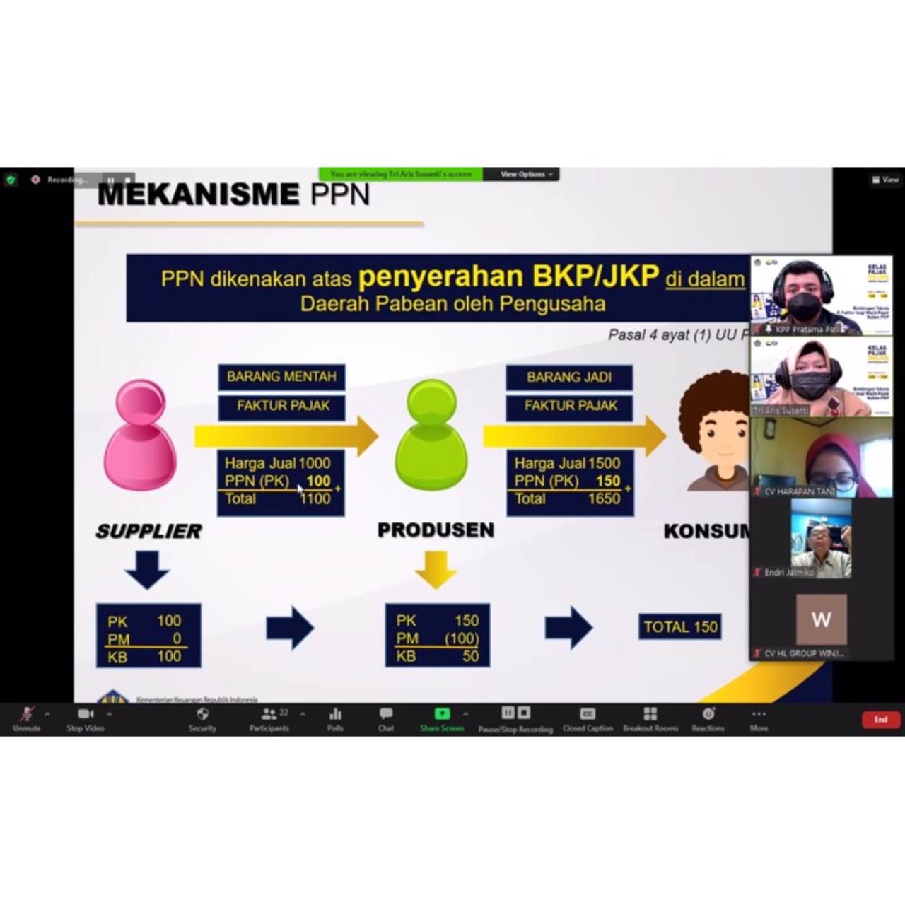 Tim Penyuluh Kantor Pelayanan Pajak (KPP) Pratama Pati melaksanakan Kelas Pajak dengan mengusung tema “Bimbingan Teknis e-Faktur bagi Wajib Pajak Badan PKP” yang diikuti oleh 19 pengurus Persekutuan Komanditer (CV) dan dilangsungkan secara daring melalui aplikasi Zoom Meeting di Pati (Kamis, 5/8)