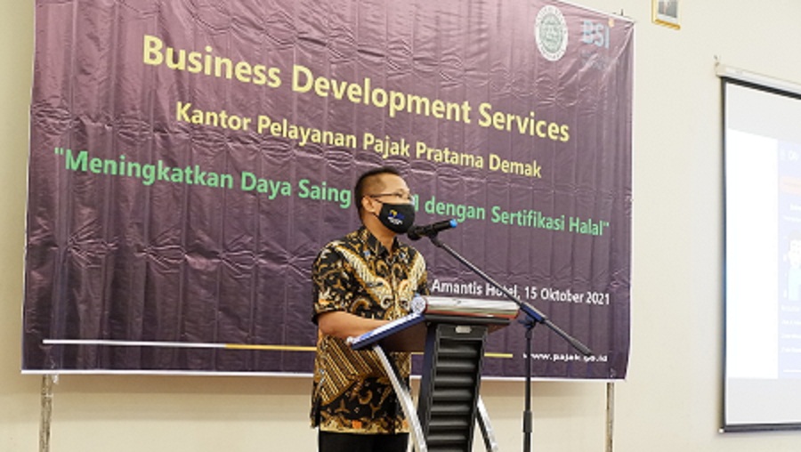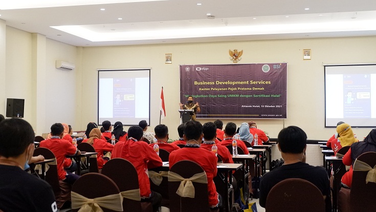 Kantor Pelayanan Pajak (KPP) Pratama Demak bekerjasama dengan Majelis Ulama Indonesia (MUI) dan Bank Syariah Indonesia (BSI) menyelenggarakan kegiatan Business Development Services dengan tema "Meningkatkan Daya Saing UMKM dengan Sertifikat Halal" di Aula Hotel Amantis Demak (Jumat,15/10). Kegiatan ini dihadiri oleh 35 wajib pajak Usaha Mikro Kecil dan Menengah (UMKM) yang berada di Kabupaten Demak.
