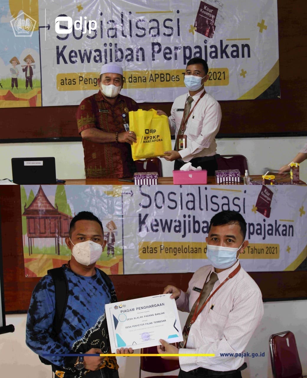 Dalam acara ini, KP2KP Martapura juga memberikan suvenir kepada seluruh bendaharawan yang hadir, serta sertifikat penghargaan kepada desa penyetor pajak terbesar pada tahun pajak 2020. Dengan sosialisasi perpajakan ini diharapkan dapat meningkatkan kesadaran dan pengetahuan serta kepatuhan bendahara desa atas kewajiban perpajakan yang harus dilaksanakan.