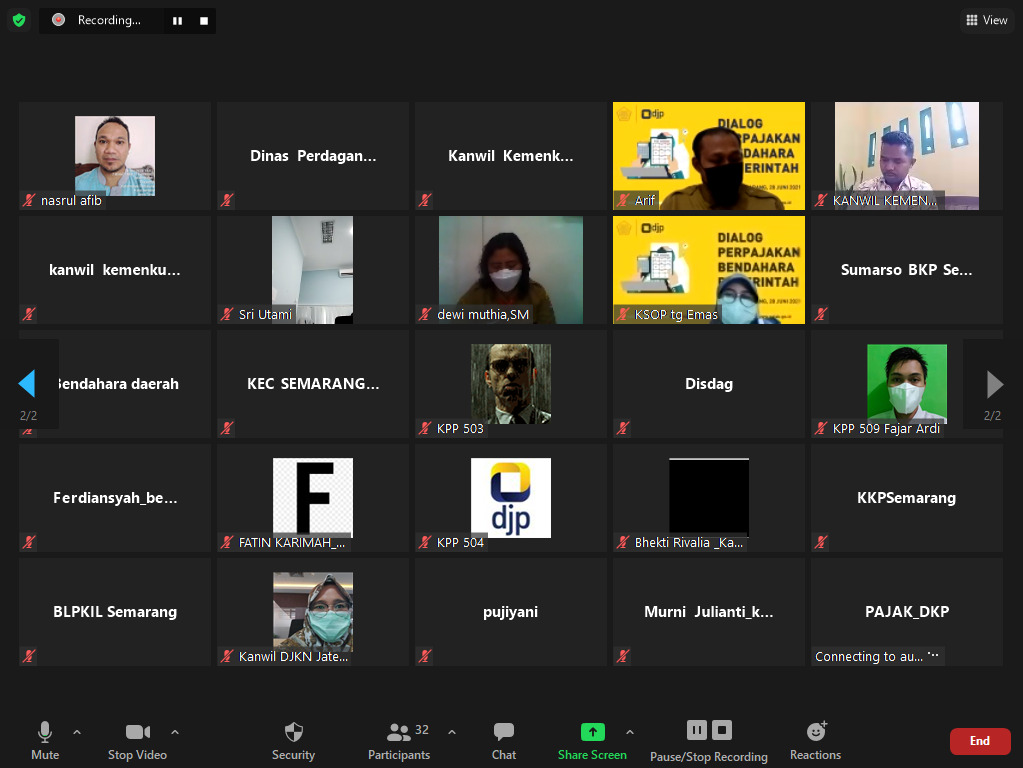 Kantor Pelayanan Pajak (KPP) Pratama Semarang Timur mengadakan sosialisasi perpajakan dengan tema "Dialog Kewajiban Perpajakan Bendahara Pemerintah" (Senin, 28/6). Kegiatan ini dilaksanakan secara daring melalui media Zoom Meeting di ruang rapat KPP Pratama Semarang Timur, Kota Semarang.