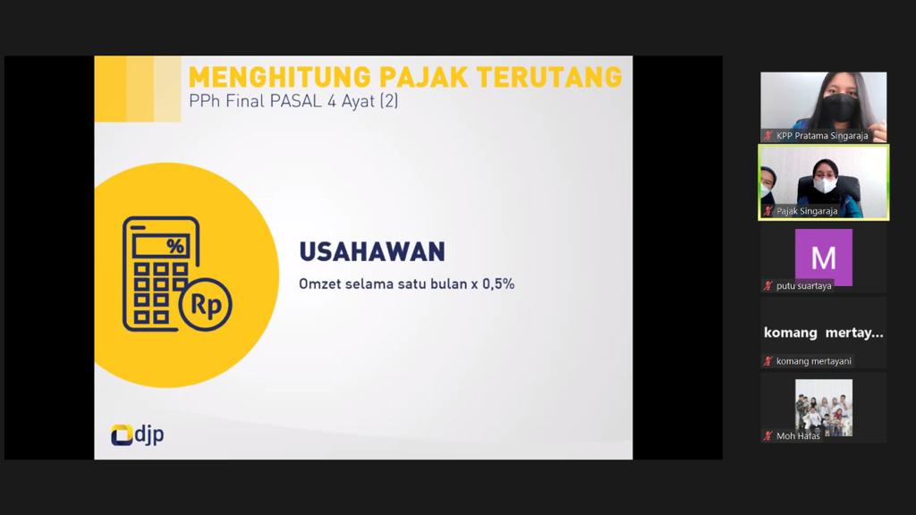 Kantor Pelayanan Pajak (KPP) Pratama Singaraja mengadakan penyuluhan kepada wajib pajak orang pribadi (WP OP) Usaha Mikro Kecil Menengah (UMKM) dengan materi Hak dan Kewajiban Perpajakan setelah memiliki Nomor Pokok Wajib Pajak (NPWP) secara daring di Kabupaten Buleleng, Bali (Selasa, 25/8).