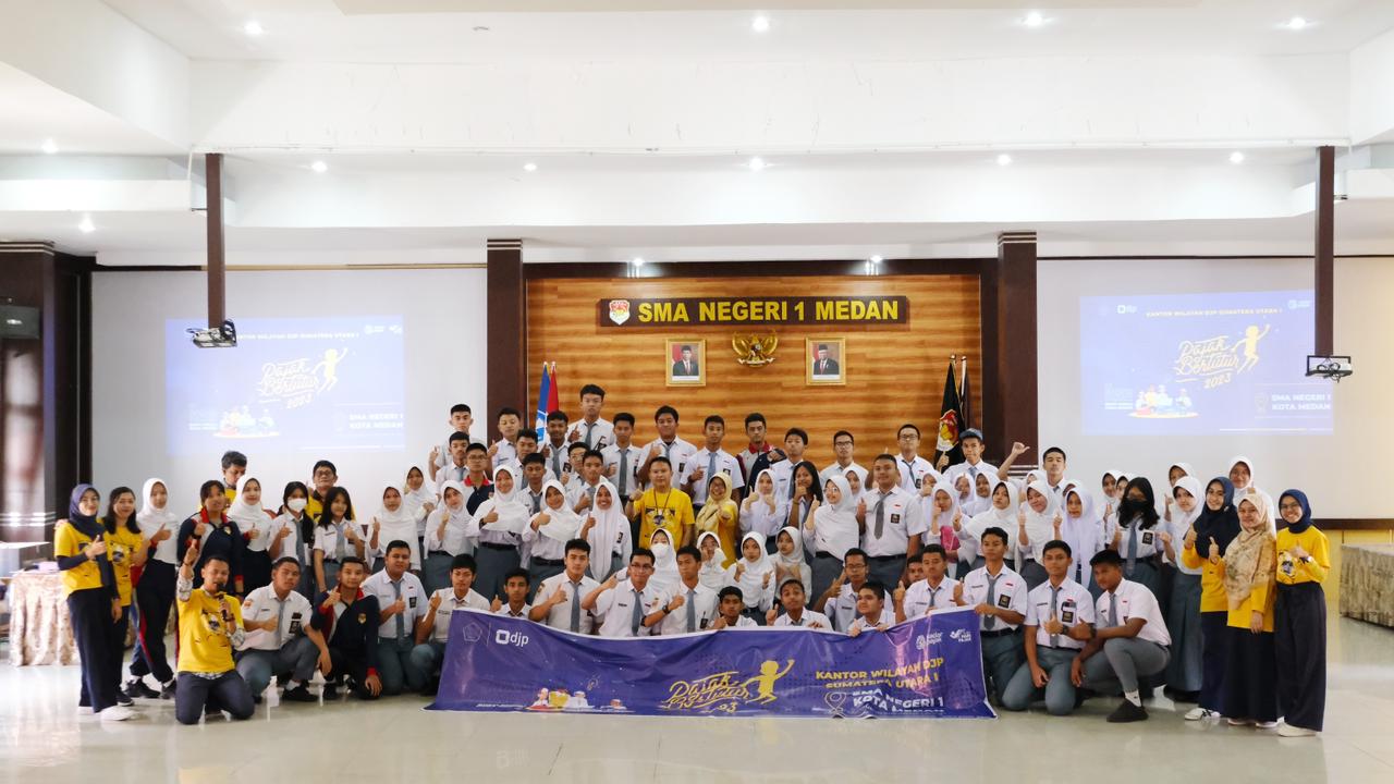 Kantor Wilayah Direktorat Jenderal Pajak Sumatera Utara I (Kanwil DJP Sumut I) menggelar Pajak Bertutur 2023 dengan tema “Sadar Pajak, Bukti Peduli Pada Negeri” di SMA Negeri 1 Medan (Kamis, 27/7). Kegiatan ini diikuti oleh 72 pelajar dari kelas X sampai dengan XII. Kegiatan diisi dengan pemaparan materi pajak dan permainan interaktif. Pajak Bertutur rutin dilaksanakan setiap tahunnya dan bertujuan untuk membentuk generasi muda yang cerdas dan sadar pajak sejak dini.