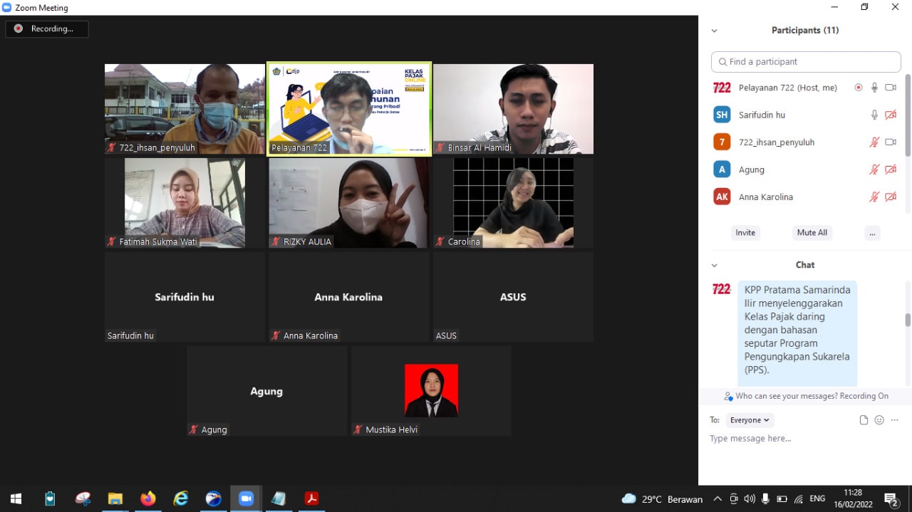 Kantor Pelayanan Pajak (KPP) Pratama Samarinda Ilir kembali pandu Wajib Pajak dalam pelaporan SPT Tahunan melalui Kelas Pajak dengan tema “Tata Cara Pelaporan SPT Tahunan Pajak Penghasilan Orang Pribadi Non Karyawan” secara daring di Kota Samarinda (Kamis, 16/2).