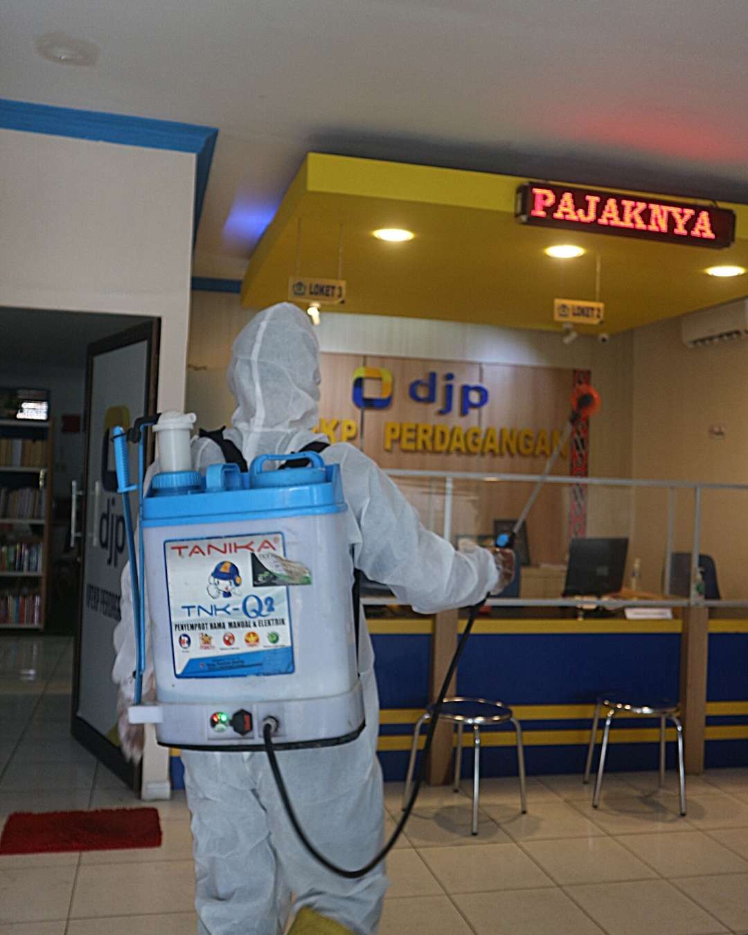 Kantor Pelayanan Penyuluhan dan Perpajakan (KP2KP) Perdagangan bekerja sama dengan Badan Penanggulangan Bencana Daerah (BPBD) Kabupaten Simalungun melakukan penyemprotan disinfektan ke seluruh bagian kantor di KP2KP Perdagangan, Kabupaten Simalungun (Rabu,14/7).