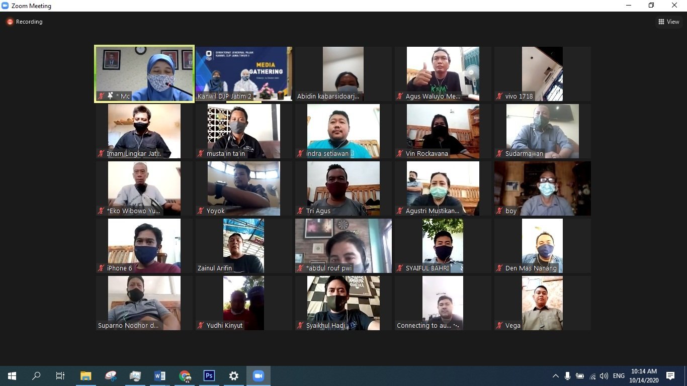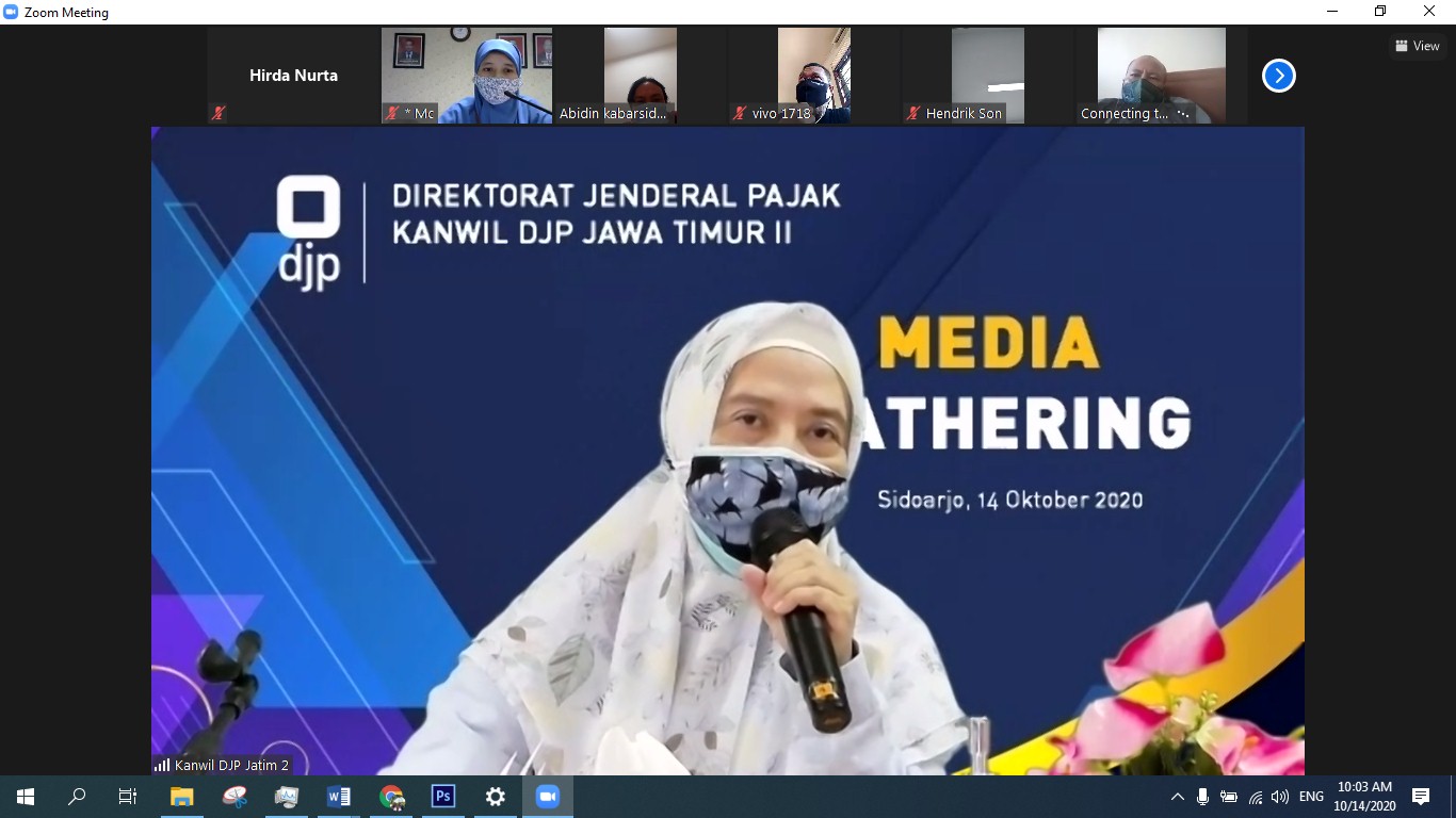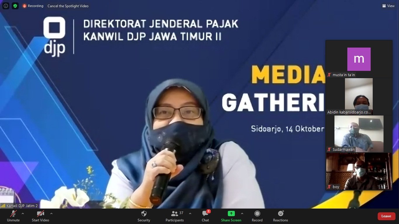 Kanwil DJP Jatim II mengumpulkan para awak media dalam acara Media Gathering yang diadakan secara daring melalui aplikasi zoom di ruang rapat Kanwil DJP Jatim II (Rabu, 14/10). Kepala Kanwil DJP Jatim II Lusiani membuka acara yang diikuti sekitar 40 wartawan dari berbagai media baik cetak, elektronik, maupun media online di wilayah Sidoarjo. Ketua Persatuan Wartawan Indonesia (PWI) Sidoarjo Abdul Rouf serta Ketua Forum Wartawan (Forwas) Sidoarjo Eko Yudho turut hadir dan menyampaikan sambutan pada kesempatan tersebut.