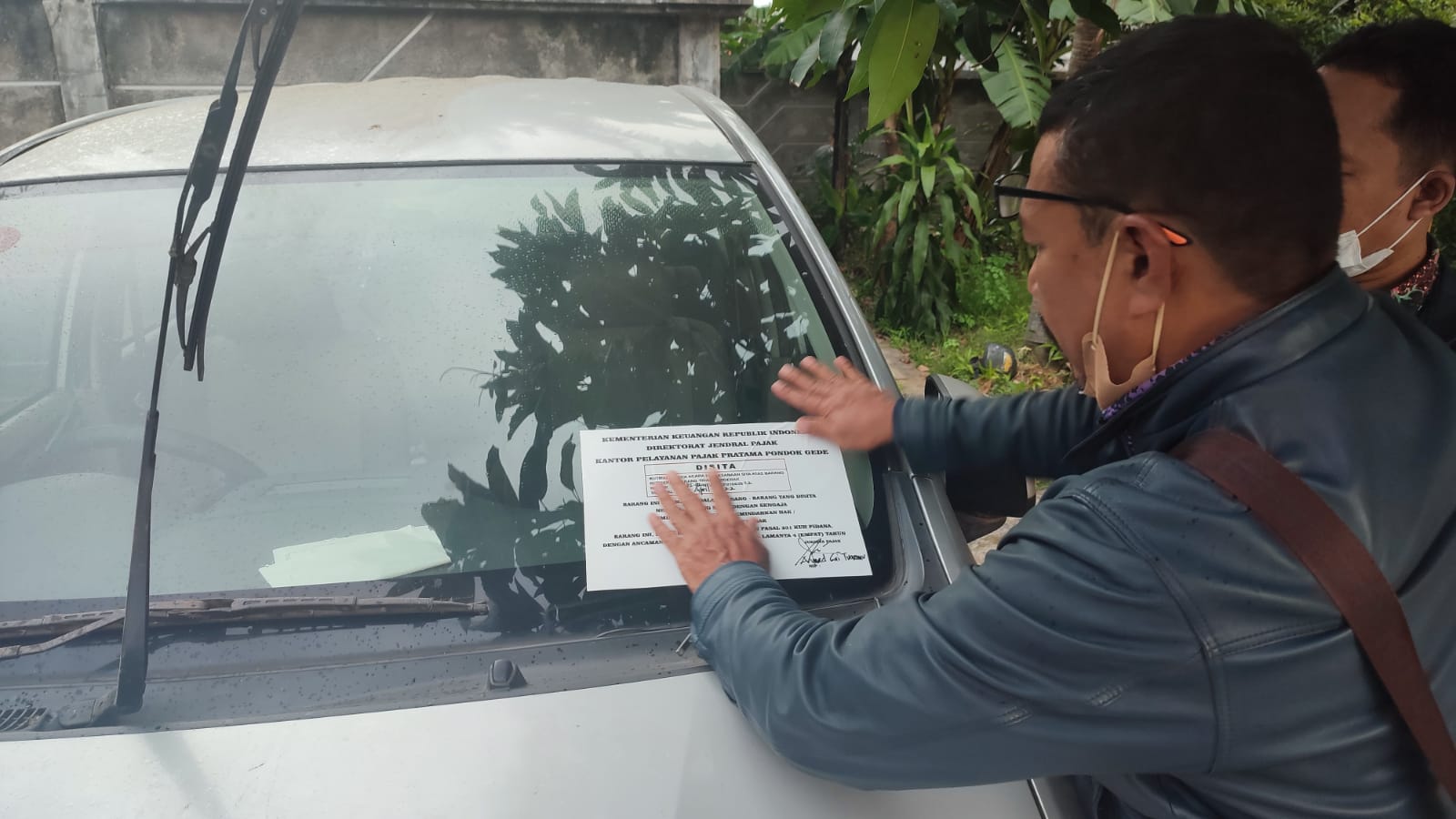 Ratna didampingi Juru Sita Pajak Negara KPP Pratama Bekasi Utara Ahmad Sai Tuasamu turut ikuti proses penyitaan. Ahmad menempelkan langsung stiker penanda penyitaan ke aset berupa mobil tersebut.