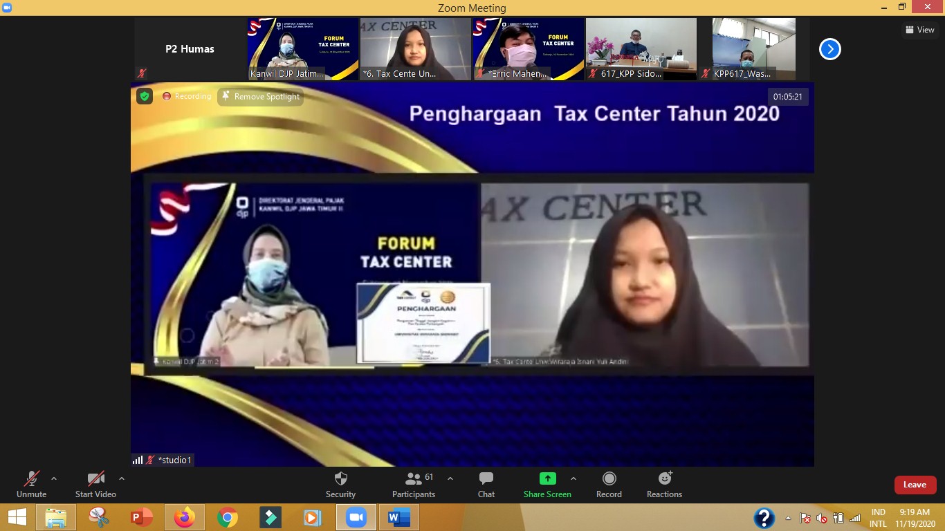 Pada kesempatan tersebut Kanwil DJP Jatim II memberikan penghargaan dengan kategori Perguruan Tinggi dengan Kegiatan Tax Center Terbanyak kepada Universitas Wiraraja Sumenep. Penyerahan penghargaan oleh Kepala Kanwil DJP Jatim II Lusiani dilakukan secara virtual kepada Ketua Tax Center Universitas Wiraraja Sumenep Isnani Yuli Andini. Isnani berterima kasih atas penghargaan yang diberikan. Isnani menyampaikan semua tercapai karena adanya kerja sama yang baik dengan KPP Pratama Pamekasan dan juga KP2KP Sumenep.