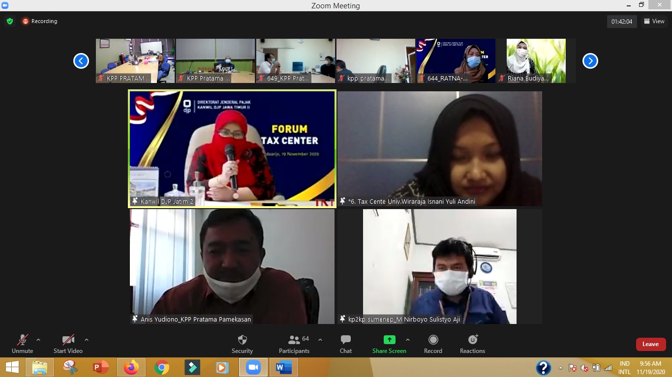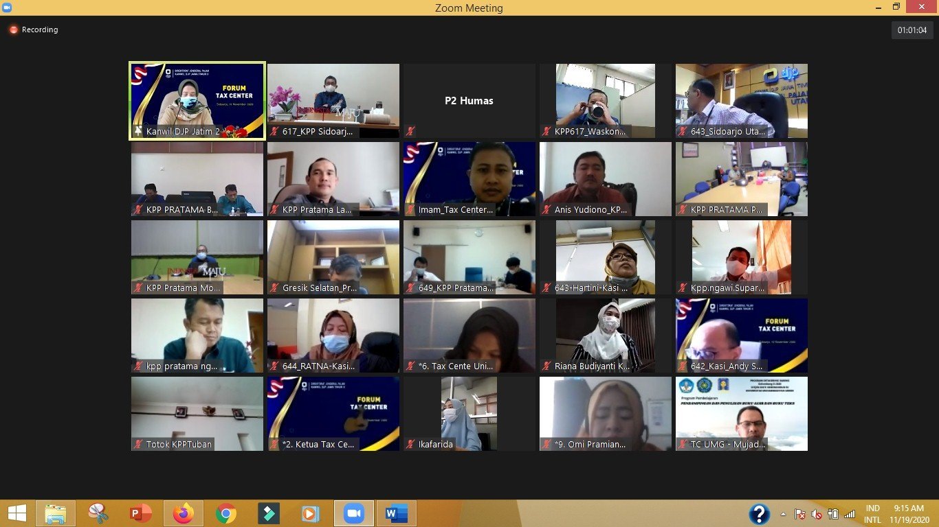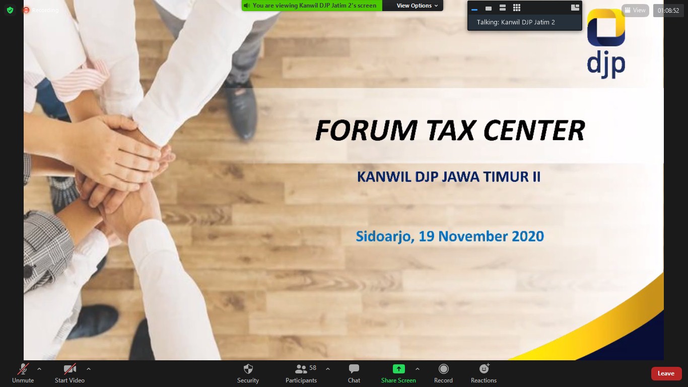 Kantor Wilayah DJP Jawa Timur II menggelar Forum Tax Center Tahun 2020 melalui zoom meeting di ruang rapat Kanwil DJP Jatim II (Kamis, 19/11). Bergabung dalam forum ini kurang lebih 60 peserta yang terdiri dari Kepala KPP Pratama serta Kepala Seksi Ekstensifikasi dan Penyuluhan di lingkungan Kanwil DJP Jatim II, Ketua Tax Center, pengurus Tax Center, dan perwakilan Duta Pajak.