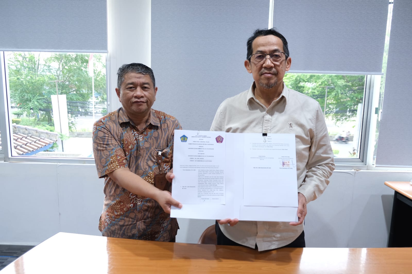Kepala Kantor Wilayah (Kanwil) Direktorat Jenderal Pajak (DJP) Banten Cucu Supriatna, S.H., M.H. bersama Rektor Universitas Muhammadiyah A.R. Fachruddin Tangerang Apt. Drs. Jaka Supriyanta, M. Farm. menandatangani Nota Kesepahaman pendirian tax center dan Perjanjian Kerja Sama Peningkatan Kesadaran Pajak pada Pendidikan Tinggi secara Desk to Desk (Senin, 8/7). Terlebih dulu Kepala Kanwil DJP Banten yang menandatangani 2 (dua) perjanjian tersebut bertempat di ruang kerja beliau pada Lantai 2 Kanwil DJP Banten Jalan Jenderal Sudirman No.34, Sumurpecung, Kota Serang, Banten pada tanggal 13 Juni 2024.