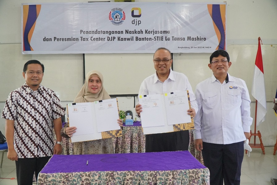 Kepala Kantor Wilayah (Kanwil) Direktorat Jenderal Pajak (DJP) Yoyok Satiotomo bersama Ketua Sekolah Tinggi Ilmu Ekonomi (STIE) La Tansa Mashiro Zakiyya Tunnufus menandatangani kesepakatan bersama pendirian tax center dan perjanjian kerja sama Peningkatan Kesadaran Pajak pada Pendidikan Tinggi antara DJP dengan STIE La Tansa Mashiro Rangkasbitung, Lebak, Banten (Senin, 20/6). Kegiatan bertujuan untuk menumbuhkan kesadaran dan semangat membayar pajak di kalangan masyarakat.