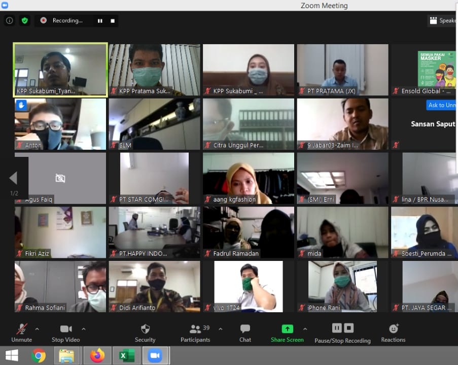 35 Wajib Pajak Badan di wilayah Sukabumi mengikuti kelas pajak secara daring dengan tema “Sosialisasi e-Bupot PPh Pasal 23/26” melalui Aplikasi Zoom di Sukabumi (Selasa, 8/9). Account Representative KPP Pratama Sukabumi Tyan Anshar menjelaskan secara detail apa itu e-Bupot dan bagaimana implementasinya.