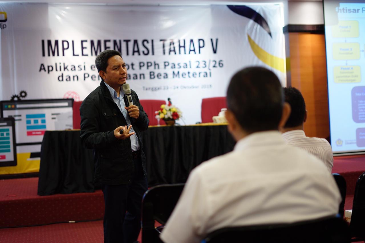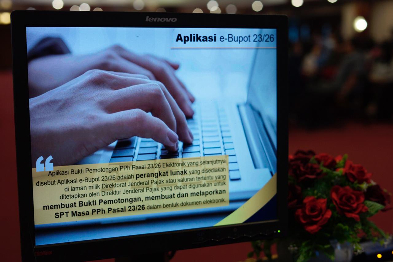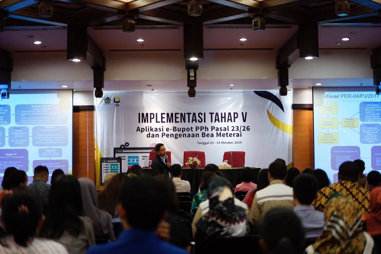 Kanwil DJP Jawa Timur I dan KPP Madya Surabaya mengadakan sosialisasi implementasi penggunaan aplikasi e-Bukti Potong PPh Pasal 23/26 kepada perwakilan dari 150 wajib pajak besar bertempat di Aula Lantai 8 Kanwil DJP Jawa Timur I (Rabu, 23/10).