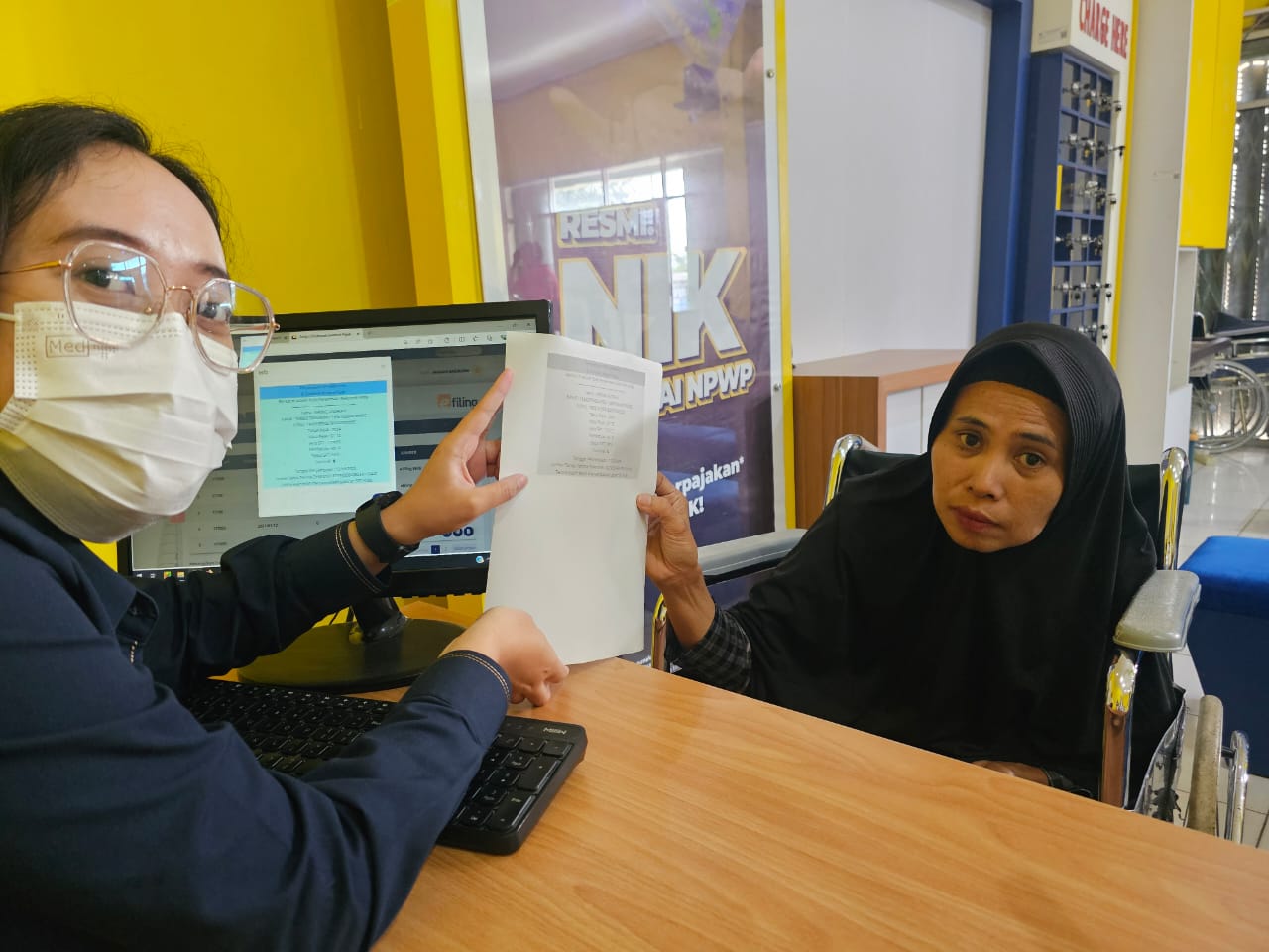 Masnie Andriani dan Elvin Prasetyo, wajib pajak pengguna kursi roda mengunjungi Kantor Pelayanan, Penyuluhan, dan Konsultasi Perpajakan (KP2KP) Pringsewu, Kabupaten Pringsewu, Lampung untuk melakukan pelaporan Surat Pemberitahuan (SPT) Tahunan (Rabu, 12/3).