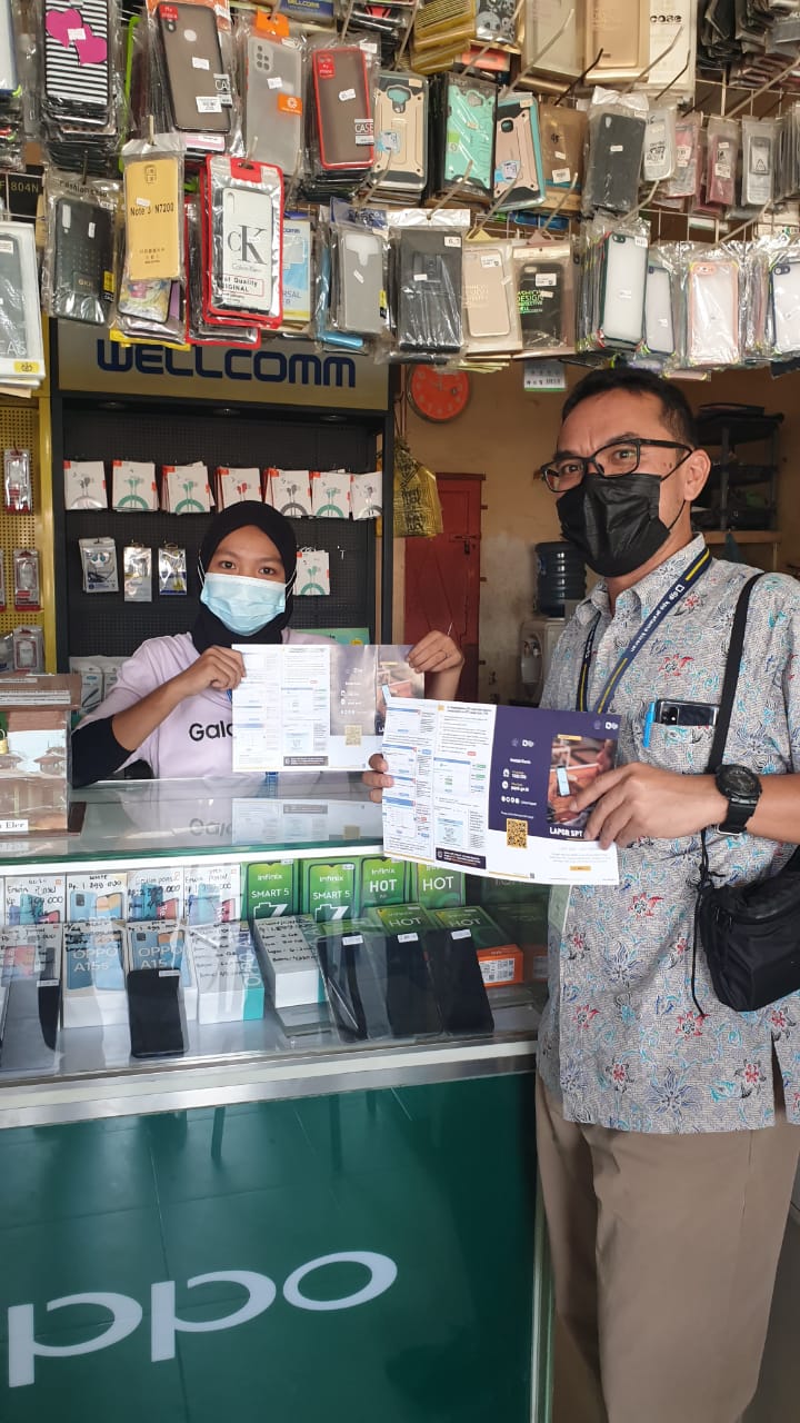 Petugas dari Kantor Pelayanan Pajak (KPP) Pratama Kisaran membagikan brosur pelaporan Surat Pemberitahuan (SPT) Tahunan Pajak Penghasilan (PPh) melalui e-Filing kepada Wajib Pajak Orang Pribadi Usahawan di kawasan pertokoan Kecamatan Tanjung Tiram, Kabupaten Batu Bara, Sumatera Utara (Jumat, 26/3). Brosur diterima oleh Wajib Pajak Orang Pribadi Usahawan yang membuka toko di kawasan pertokoan tersebut. Tim dari KPP Pratama Kisaran membagikan brosur sambil menjelaskan tentang tata cara pelaporan SPT Tahunan PPh melalui e-Filing.