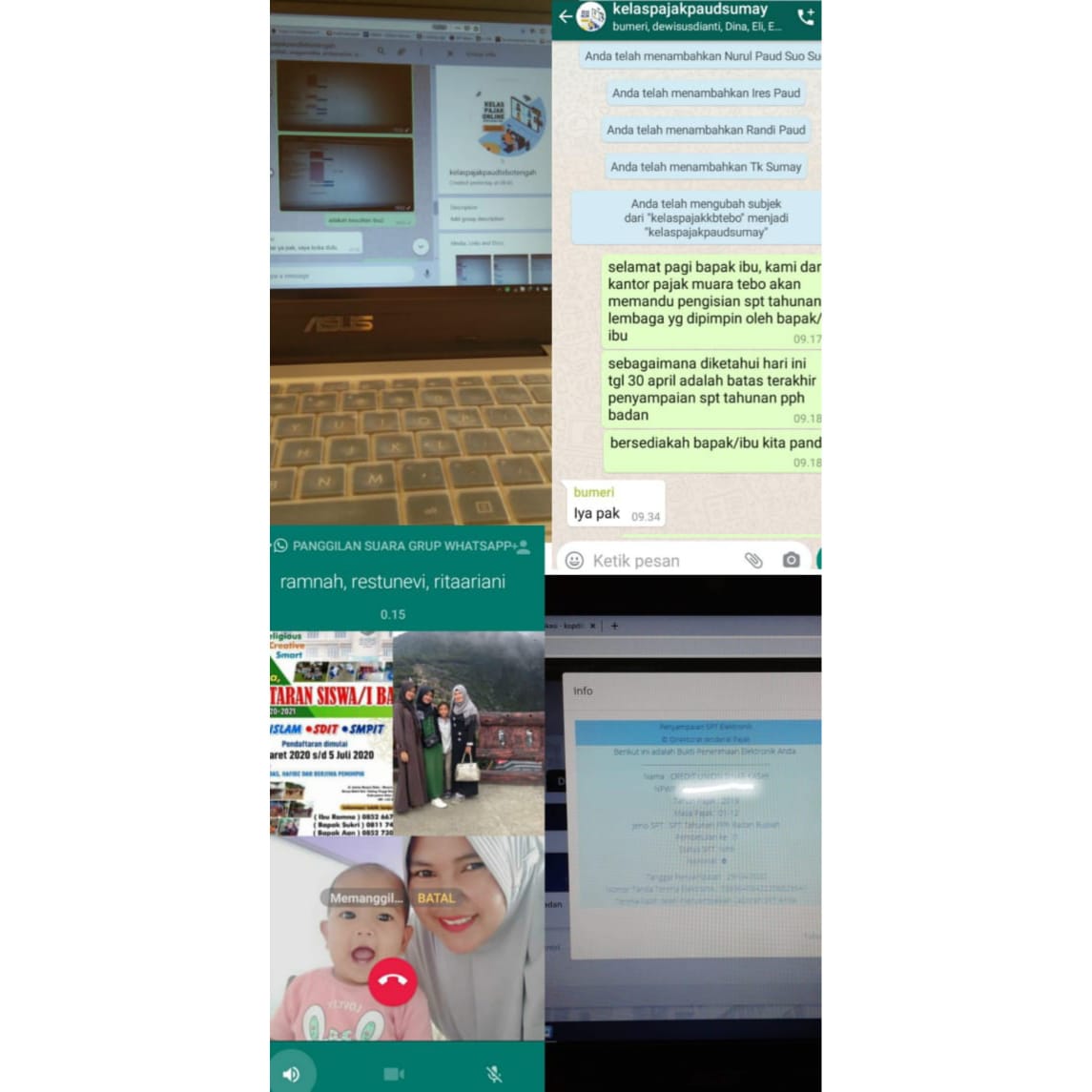 Sebagai bentuk pencegahan persebaran pandemi Covid-19, KP2KP Muara Tebo mengadakan kelas pajak tentang Tata Cara Pelaporan SPT Tahunan secara elektronik melalui e-Form dengan membentuk grup WhatsApp (Jumat, 24/4). Kelas pajak daring ini diikuti oleh Wajib Pajak (WP) Badan yang terdaftar di KP2KP Muara Tebo.