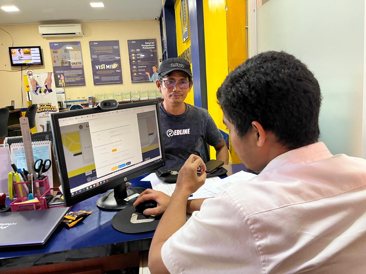 Setelah mendengar penjelasan Rahmat, Abi meminta Rahmat untuk memberikan asistensi tata cara menggunakan layanan e-PBK. “Saya mau belajar cara pakai e-PBK, Pak. Mohon bantuannya,” ucap Abi. Rahmat kemudian segera memandu wajib pajak untuk mengajukan pemindahbukuan melalui laman pajak.go.id menggunakan laptop pribadi wajib pajak.