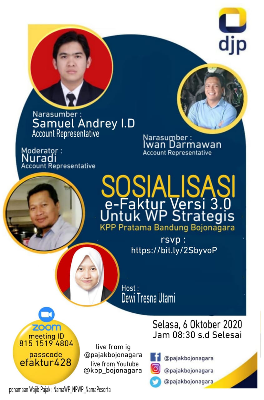 Kantor Pelayanan Pajak (KPP) Pratama Bandung Bojonagara menyelenggarakan Bimbingan Teknis (Bimtek) Aplikasi e-Faktur versi 3.0 secara daring melalui Zoom Meeting yang dipandu dari KPP Pratama Bandung Bojonagara (Selasa, 6/10). Bimtek ini bertujuan untuk membantu para Wajib Pajak (WP) yang merupakan Pengusaha Kena Pajak (PKP) Strategis di KPP Pratama Bandung Bojonagara dalam memahami dan mengimplementasikan aplikasi e-Faktur versi 3.0.