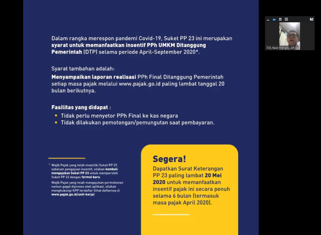 Kelas Pajak kedua ini mengangkat tema tentang sosialisasi atas Peraturan Menteri Keuangan nomor 44/PMK.03/2020 tentang Insentif Pajak untuk wajib pajak yang terdampak pandemi Covid-19. Namun, sesi kelas pajak kali ini lebih difokuskan bagi wajib pajak UMKM.