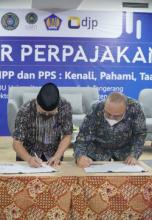 Tangerang, 28 Juni 2022– Kepala Kanwil DJP Banten Yoyok Satiotomo menandatangani Memorandum of Understanding (MoU) pendirian tax center dan Perjanjian Kerjasama (PKS) program inklusi pajak dengan Rektor Universitas Muhammadiyah Tangerang (UMT) DR. Ahmad Amarullah di Aula Jenderal Sudirman Kampus UMT.