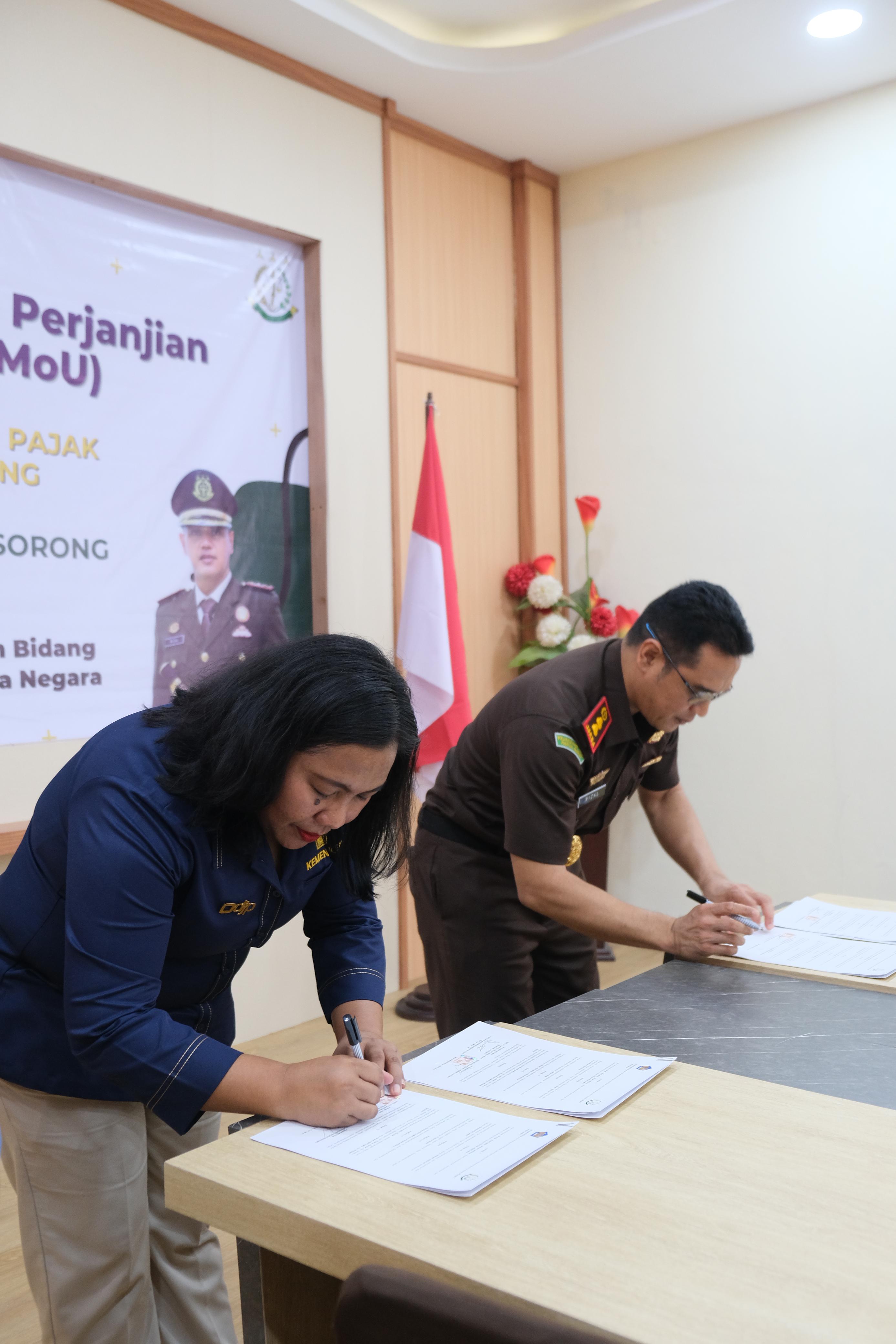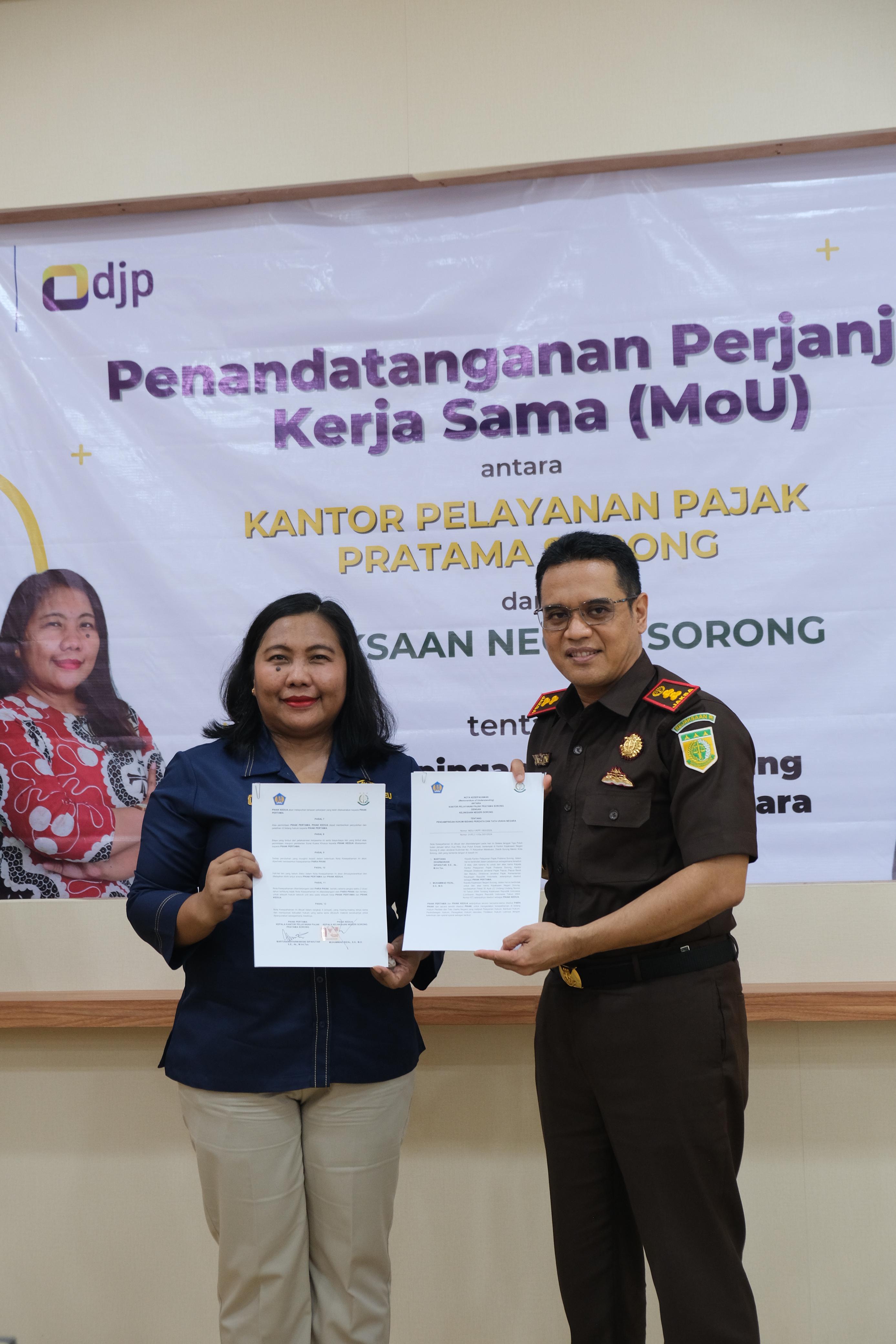 Kantor Pelayanan Pajak (KPP) Pratama Sorong dan Kejaksaan Negeri Sorong menjalin kerja sama terkait pendampingan hukum di bidang perdata dan tata usaha negara di Aula Kejaksaan Negeri Sorong (Selasa, 30/1). Jalinan kerja sama tersebut secara formal telah disahkan melalui kegiatan penandatanganan perjanjian kerja sama atau yang selanjutnya disebut MoU yang dihadiri dan ditandatangani secara langsung oleh Martiana Dharmawani Sipahutar selaku Kepala KPP Pratama Sorong dan Muhammad Rizal selaku Kepala Kejaksaan Negeri Sorong.
