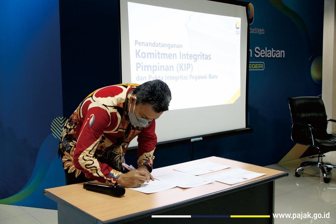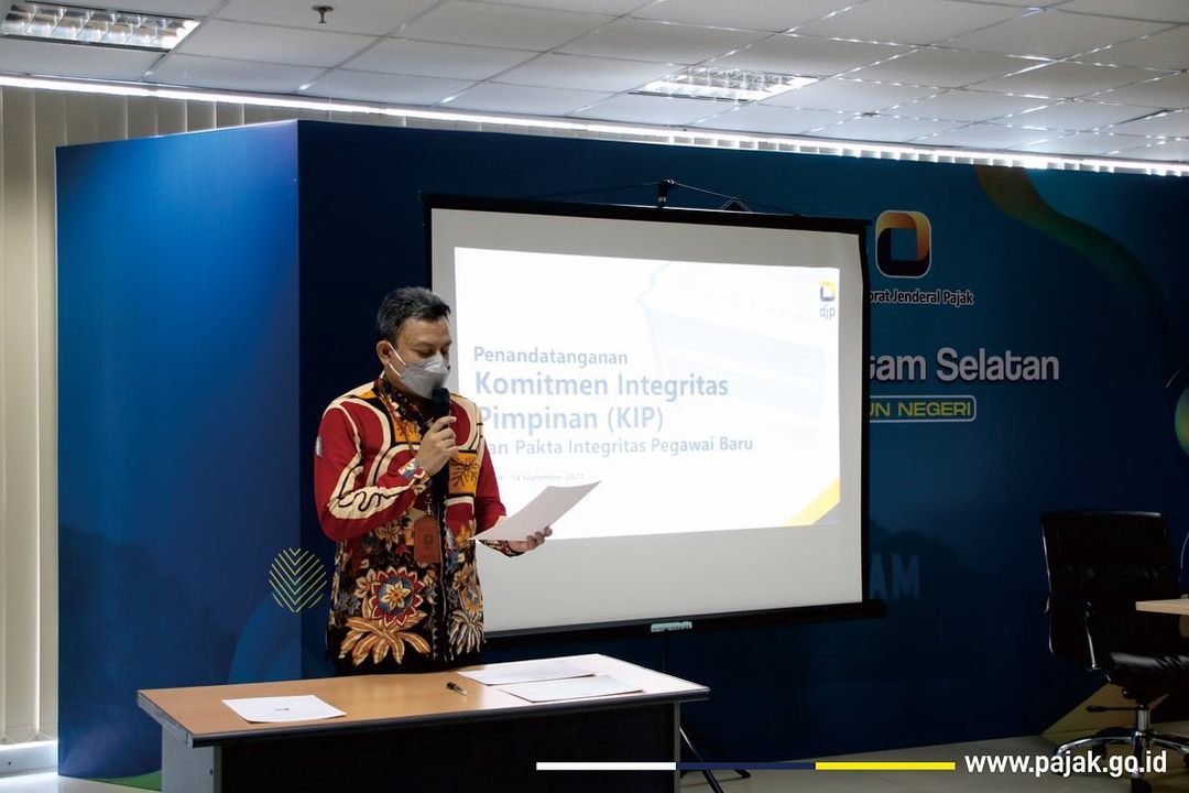 Kepala Kantor Pelayanan Pajak (KPP) Pratama Batam Selatan Denny Tri Satrianto menandatangani lembar Komitmen Integritas Pimpinan (KIP) sebagai bentuk komitmen penegakan integritas baik dalam hal wewenang/jabatan serta pelayanan kepada wajib pajak (Selasa, 14/9). Seremonial acara tersebut dilaksanakan di ruang aula KPP Pratama Batam Selatan, Kota Batam, Kepulauan Riau.
