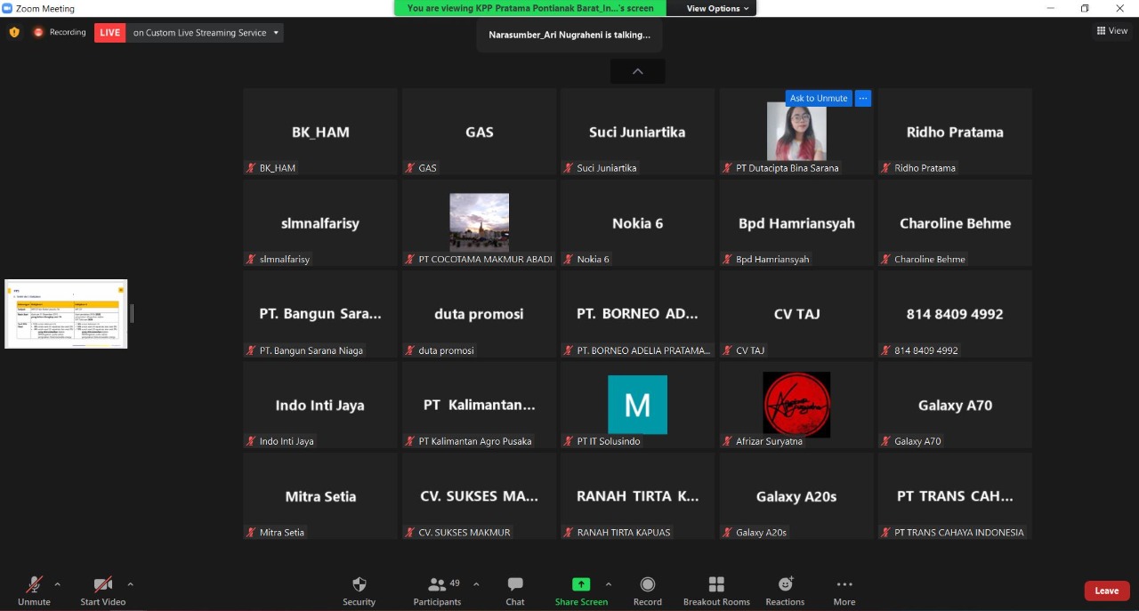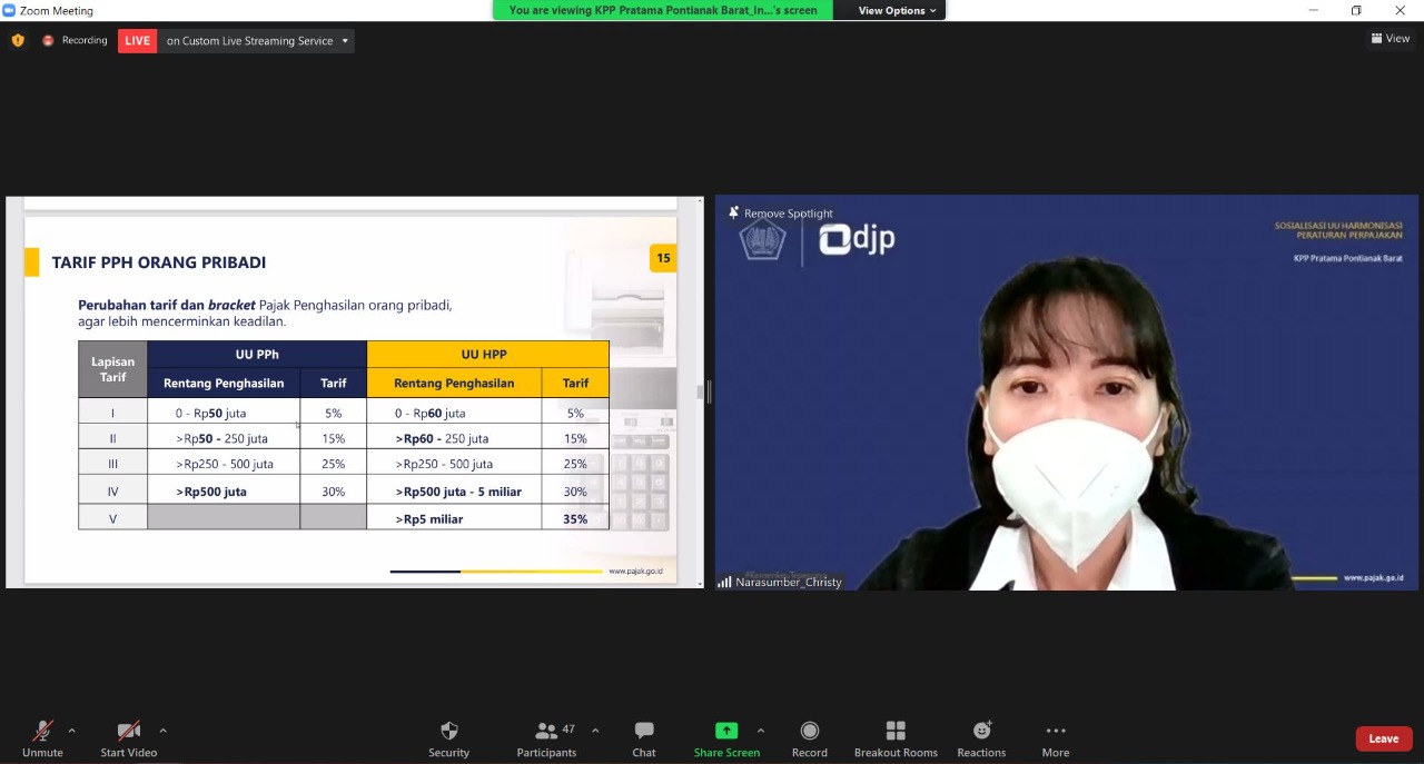 KPP Pratama Pontianak Barat mengadakan kelas pajak tentang Undang-Undang Harmonisasi Peraturan Perpajakan secara daring, di ruang Multimedia KPP Pratama Pontianak Barat, Pontianak, (Jumat 17/12). Indaraputuri Nurmasruri, Christy Linaria, Ari Nugraheni Penyuluh Pajak menjelaskan undang-undang ini kepada masyarakat umum dan wajib pajak badan strategis selama satu jam. Kelas pajak ini ditutup dengan sesi tanya jawab antara peserta dengan pembicara.