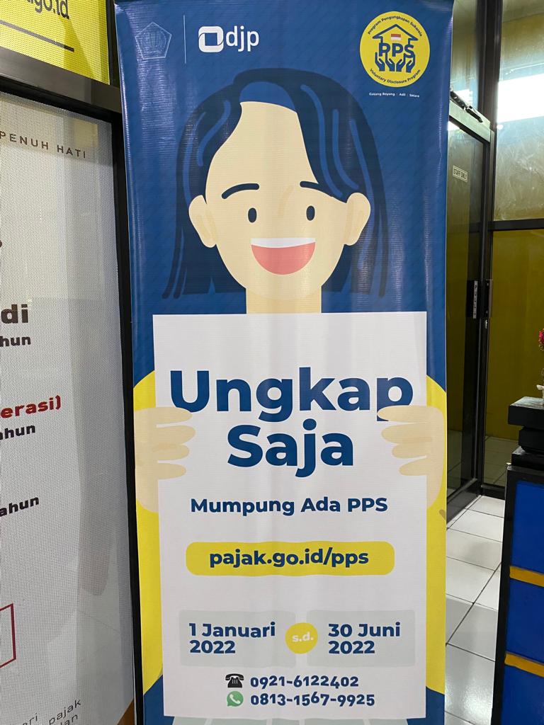 Kantor Pelayanan Penyuluhan dan Konsultasi Perpajakan (KP2KP) Maba membuka loket layanan helpdesk yang melayani Program Pengungkapan Sukarela (PPS) di Tempat Pelayanan Terpadu (TPT) KP2KP Maba, kabupaten Halmahera Timur (Senis,17/1). Tujuan dari kegiatan ini sebagai tindak lanjut dari pelaksanaan Undang-Undang Nomor 7 Tahun 2021 tentang Harmonisasi Peraturan Perpajakan (UU HPP) terkait PPS.