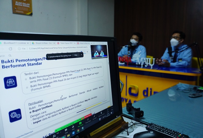 Hadir sebagai narasumber, Penyuluh Pajak Delima Boru Manalu dan Bramantha Aditya Rangga menyampaikan kewajiban Pemotong atau Pemungut Pajak Penghasilan (PPh), batas waktu pelaporan bukti pemotongan/pemungutan unifikasi menggunakan SPT Masa PPh Unifikasi, dan penjelasan mengenai sanksi keterlambatan pelaporan dan pembayaran.