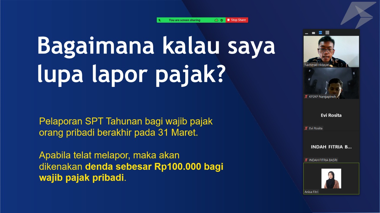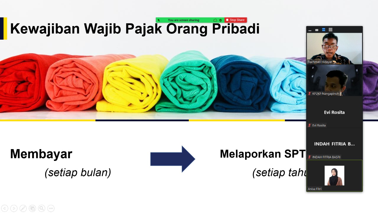 Kantor Pelayanan Penyuluhan dan Konsultasi Perpajakan (KP2KP) Nanga Pinoh mengadakan kelas pajak daring untuk Wajib Pajak Orang Pribadi, Melawi (Jumat 10/6). Peserta dari kelas pajak ini adalah wajib pajak yang tercatat baru memiliki NPWP. Kelas pajak ini mereka selenggarakan supaya masyarakat di Kabupaten Melawi yang baru saja mendaftar menjadi wajib pajak dapat memahami lebih dalam kewajiban apa saja yang perlu dilakukan setelah memiliki NPWP.