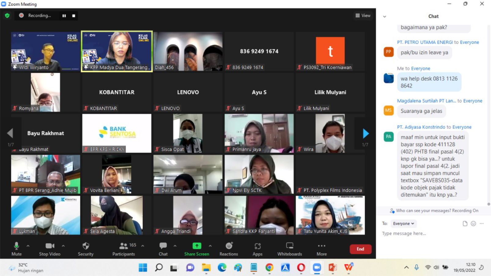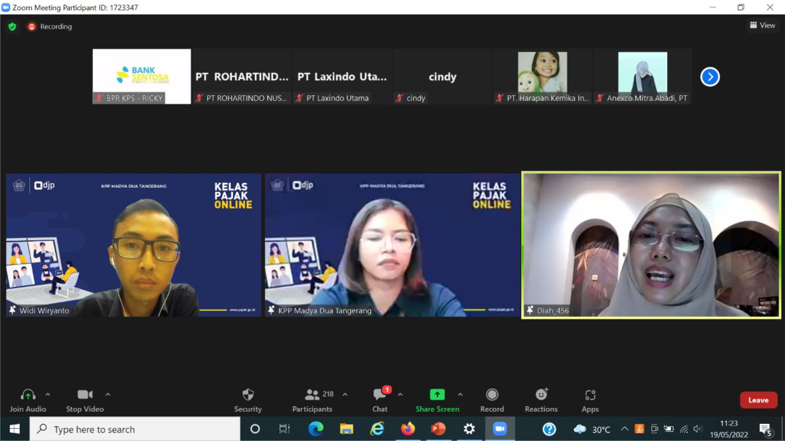 Kantor Pelayanan Pajak (KPP) Madya Dua Tangerang mengadakan Kelas Pajak Surat Pemberitahuan (SPT) Masa Pajak Penghasilan (PPh) Unifikasi yang dilaksanakan secara daring melalui aplikasi Zoom Meeting dan diikuti lebih dari 200 wajib pajak di ruang penyuluhan KPP Madya Dua Tangerang, Kabupaten Tangerang (Kamis, 19/5).