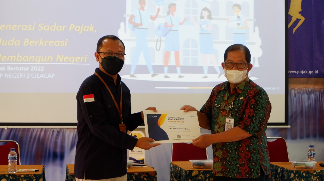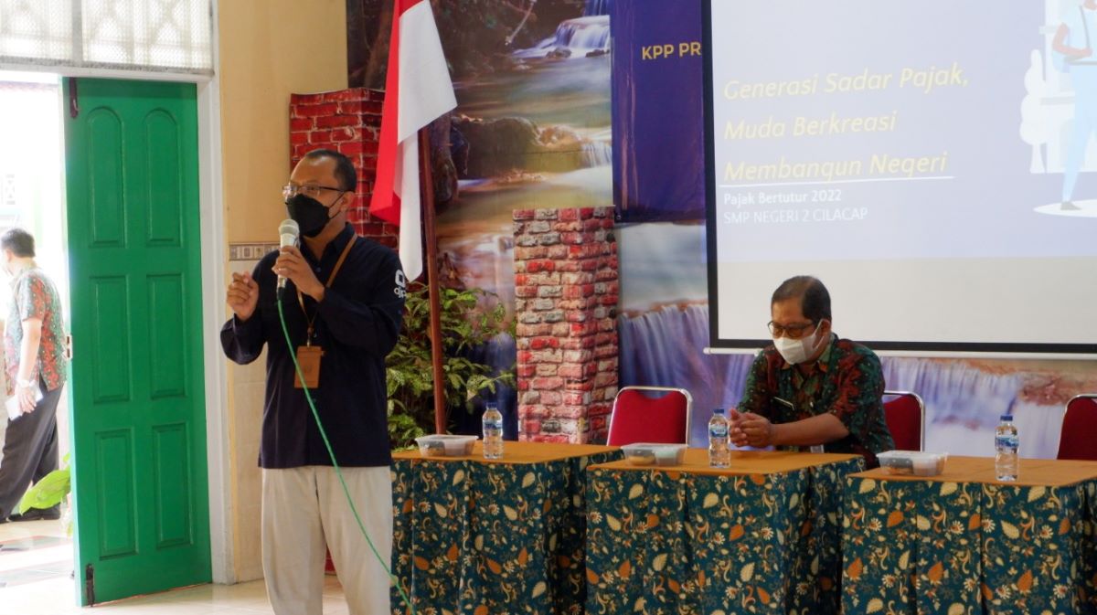 Bekerja sama dengan SMP Negeri 2 Cilacap, Kantor Pelayanan Pajak (KPP) Pratama Cilacap melaksanakan kegiatan Pajak Bertutur (Kamis, 18/08). Sejalan dengan menurunnya pandemi Covid-19, kegiatan yang diikuti oleh 50 peserta dilaksanakan secara luring di aula SMP Negeri 2 Cilacap. Mengusung tema “Muda Berkreasi, Membangun Negeri” diisi dengan penyampaikan materi dengan mengajak para siswa untuk berdiskusi dan bermain games.