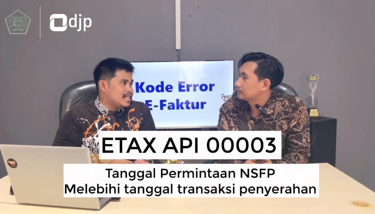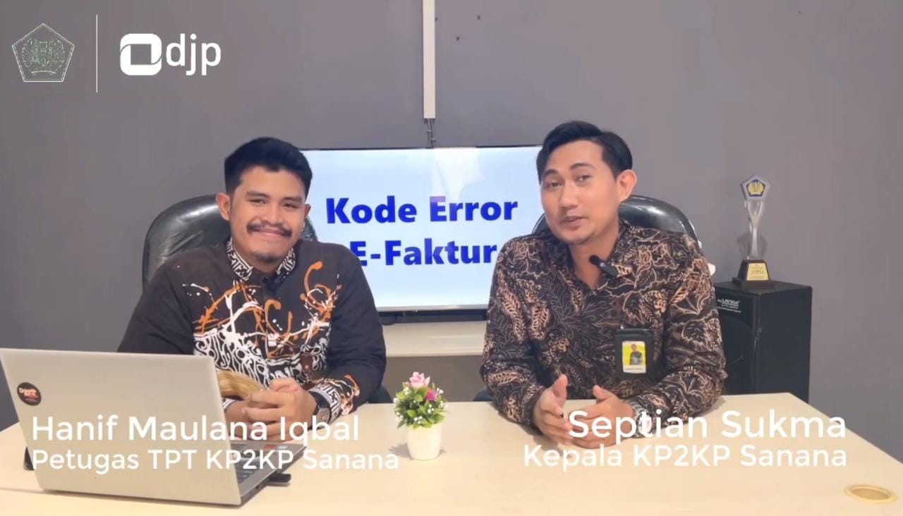 Kantor Pelayanan, Penyuluhan, dan Konsultasi Perpajakan (KP2KP) Sanana menghadirkan kembali Sanana pe Podcast (Rabu, 30/11). Episode kelima siniar tersebut membahas kode eror pada e-Faktur. Pada siniar yang dipandu Kepala KP2KP Sanana Septian Sukma dan pegawai K2KP Sanana Hanif Maulana Iqbal ini membahas beberapa kode eror yang cukup sering ditemui kawan pajak ketika menggunakan aplikasi e-Faktur, seperti Error ETAX API 10010, Error ETAX API 00003, Error ETAX 40001, dan Error ETAX 40002.