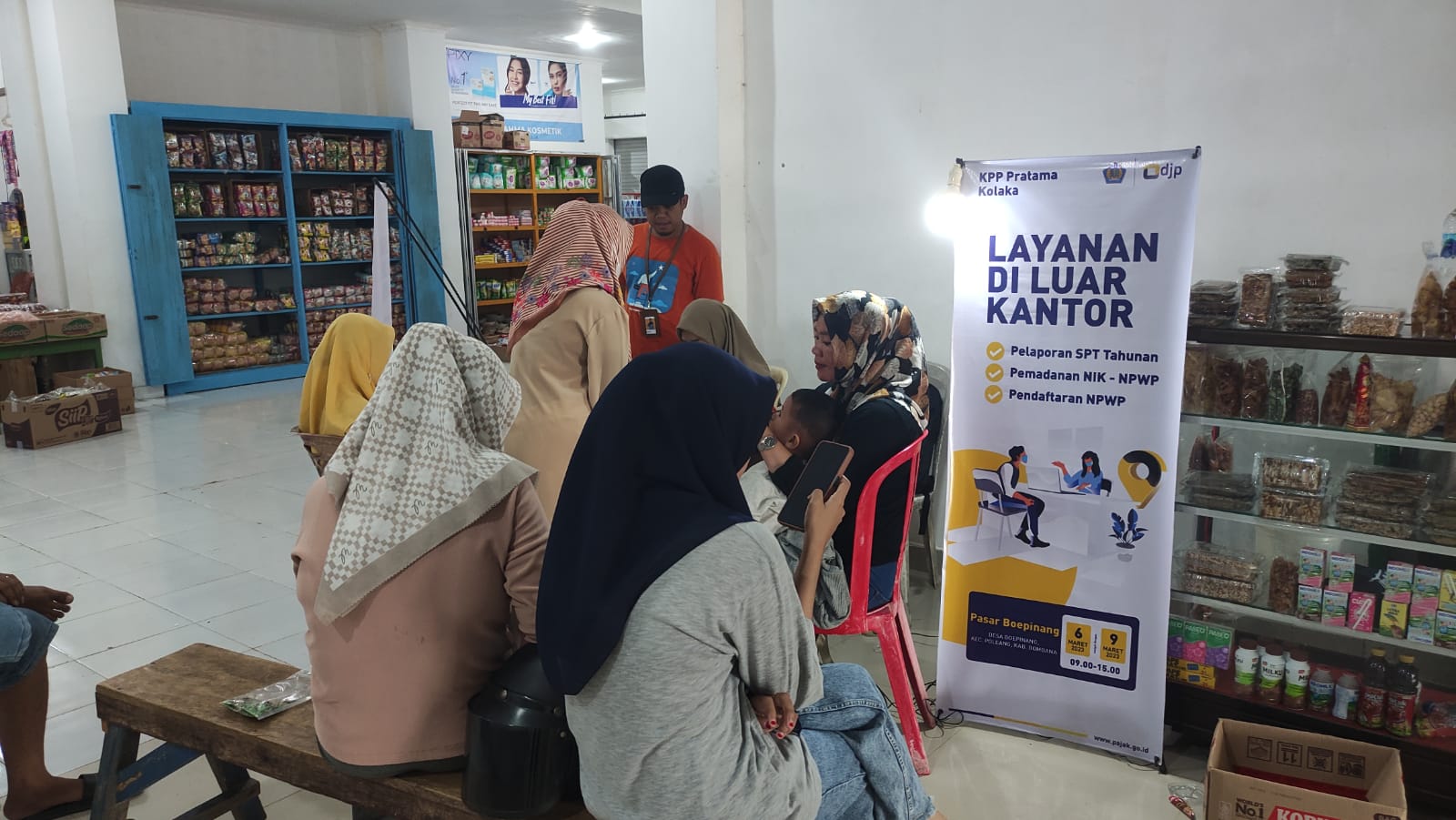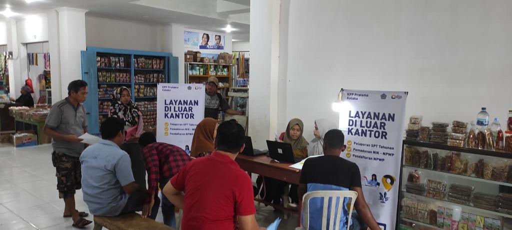 Kantor Pelayanan Pajak (KPP) Pratama Kolaka membuka layanan luar kantor di Pasar Boepinang (Senin 6/3). Layanan luar kantor ini bertujuan untuk memperluas jangkauan layanan perpajakan khususnya layanan asistensi pelaporan Surat pemberitahuan (SPT) Tahunan Pajak Penghasilan (PPh) Orang Pribadi dan pemadanan Nomor Induk Kependudukan (NIK) sebagai Nomor Pokok Wajib Pajak (NPWP).