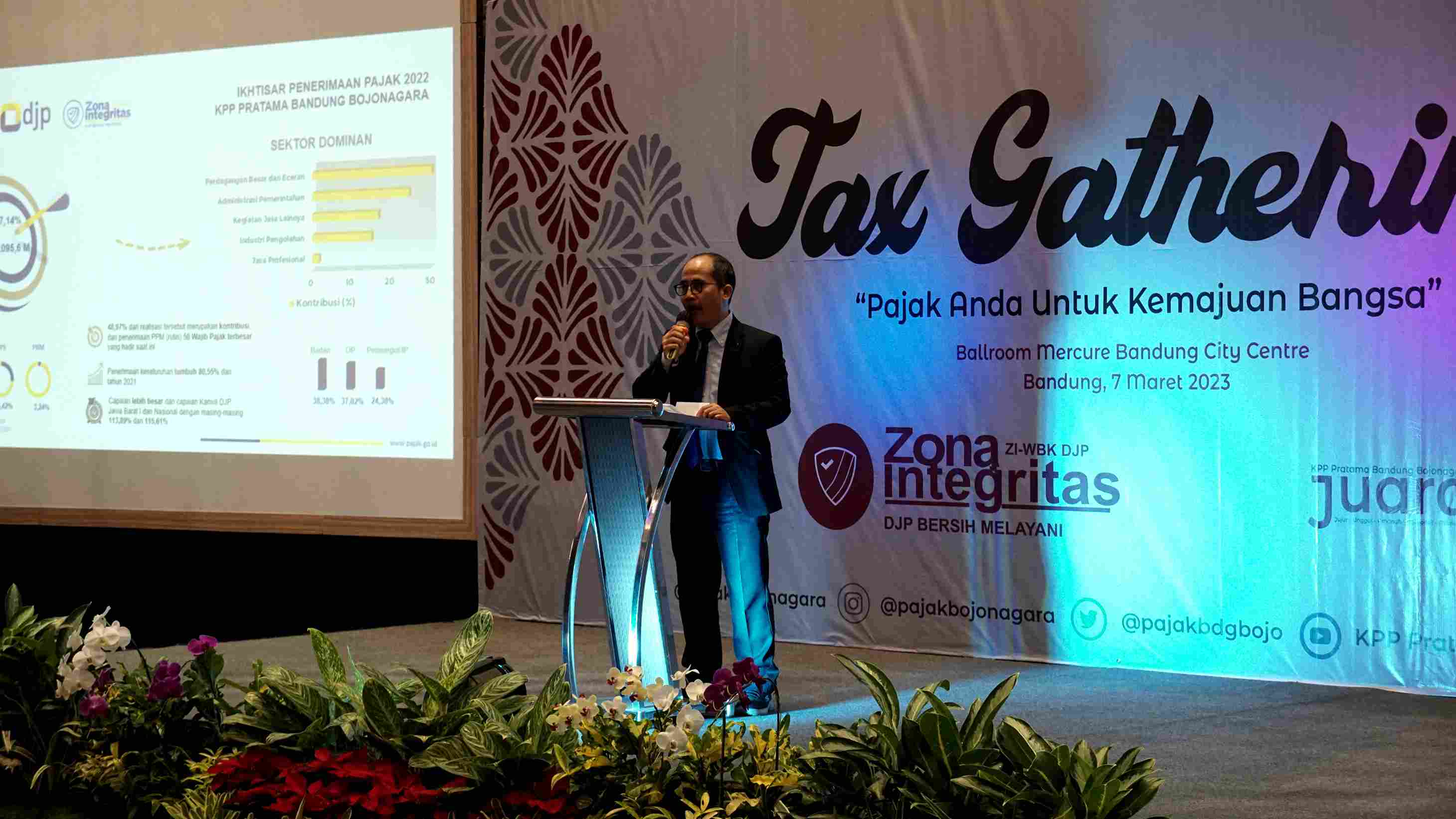 Kantor Pelayanan Pajak (KPP) Pratama Bandung Bojonagara memberikan apresiasi kepada para wajib pajak besar yang terdaftar di KPP Pratama Bandung Bojonagara dalam acara Tax Gathering Tahun 2023 di Hotel Mercure Jalan Lengkong Besar Nomor 008, Cikawao, Bandung, Jawa Barat (Selasa, 7/3).