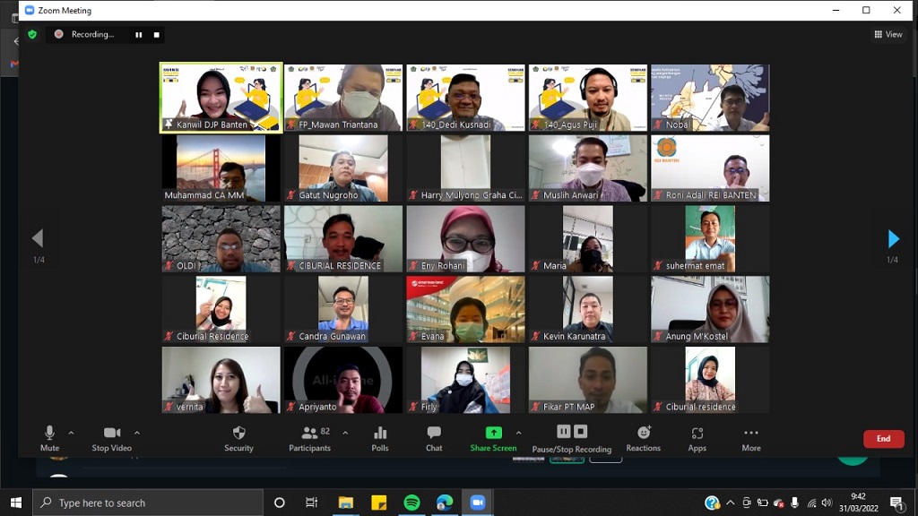 Kantor Wilayah DJP Banten terus gencar melakukan sosialisasi Program Pengungkapan Sukarela (PPS) kepada para anggota Real Estate Indonesia (REI) Banten secara daring melalui aplikasi zoom cloud meeting di Kota Serang, Banten (Kamis, 31/3).