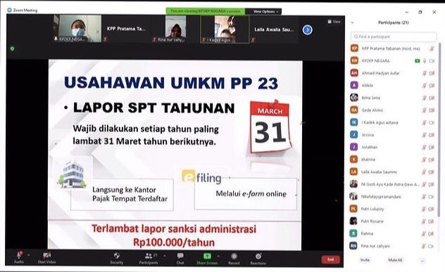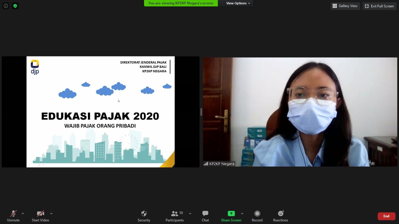Kantor Pelayanan, Penyuluhan dan Konsultasi Perpajakan (KP2KP) Negara mengadakan edukasi secara daring mengenai Hak dan Kewajiban Perpajakan Wajib Pajak Orang Pribadi dengan media Zoom Meeting di Negara (Rabu, 4/11). Wajib pajak yang menjadi sasaran kegiatan edukasi merupakan wajib pajak orang pribadi yang baru memiliki Nomor Pokok Wajib Pajak.