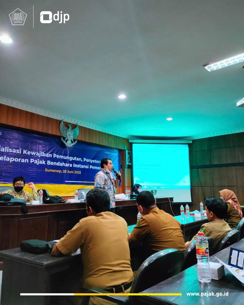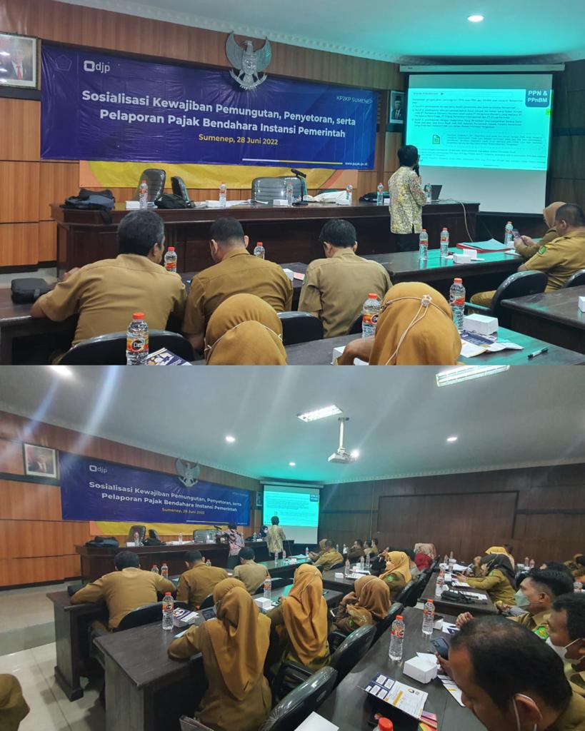 Kantor Pelayanan Pajak (KPP) Pratama Pamekasan bersama Kantor Pelayanan, Penyuluhan, dan Konsultasi Perpajakan (KP2KP) Sumenep mengundang 66 orang Bendahara Instansi Pemerintah Kab. Sumenep untuk mengikuti sosialisasi “Kewajiban Pemungutan, Penyetoran, serta Pelaporan Pajak Bendahara Instansi Pemerintah”. Kegiatan berlangsung mulai pukul 09.00 s.d. 12.00 WIB di Aula BPKAD Kab. Sumenep (Selasa, 28/06).