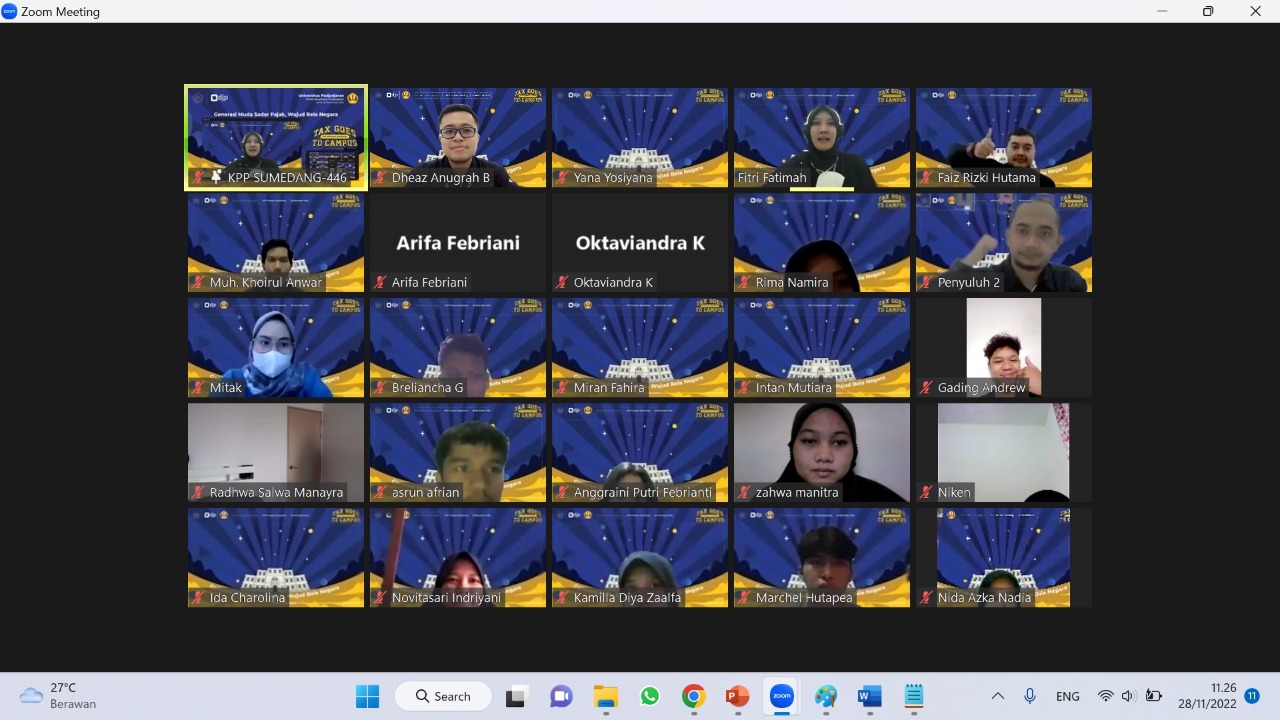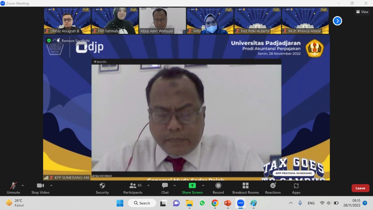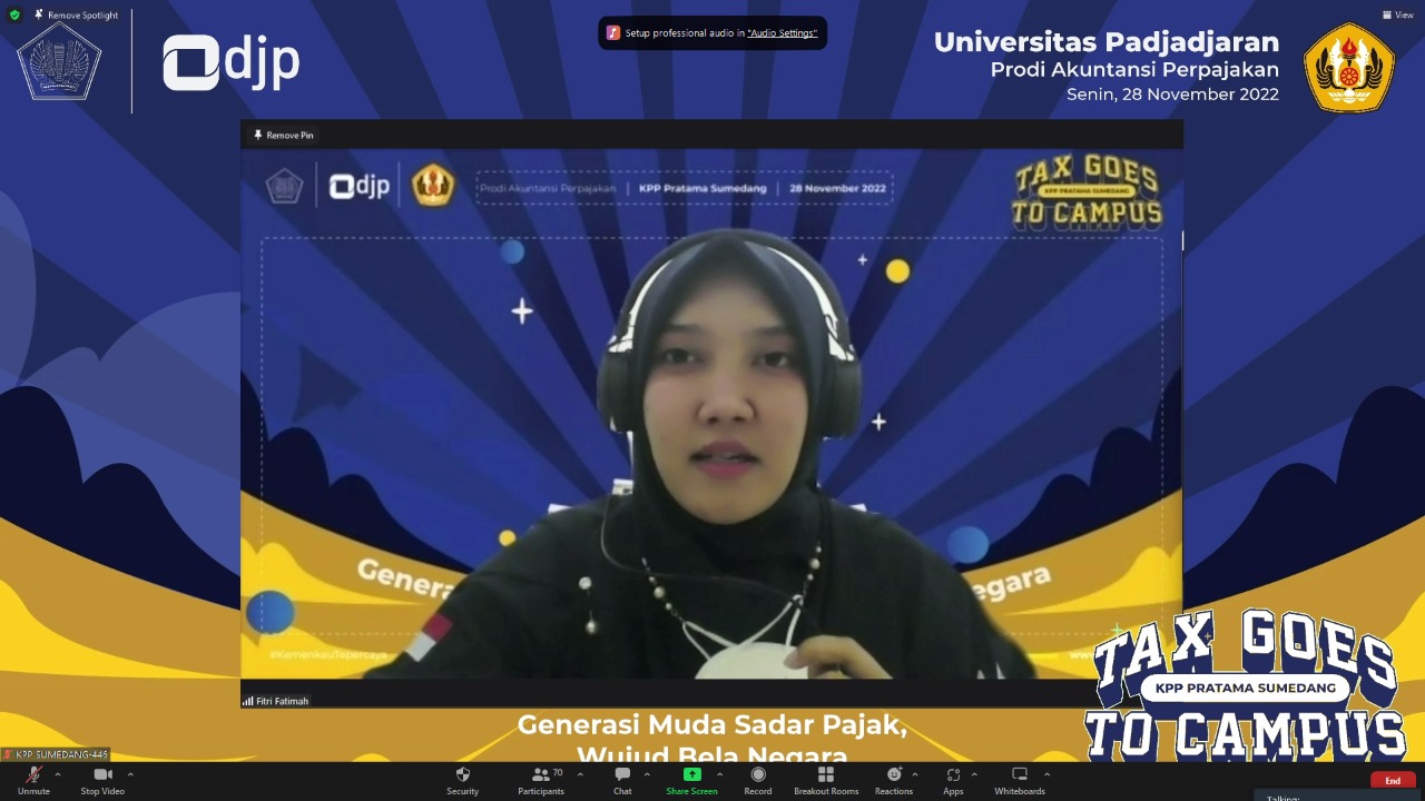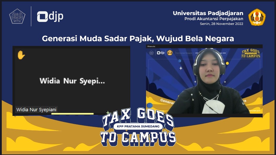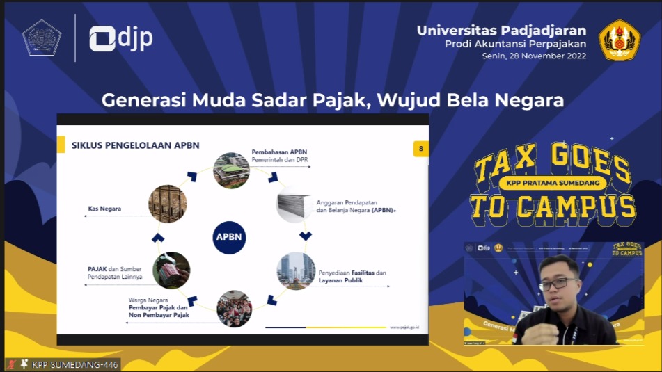 Kantor Pelayanan Pajak (KPP) Pratama Sumedang bersama Universitas Padjadjaran (UNPAD) menyelenggarakan Tax Goes To Campus (TGTC) secara daring melalui aplikasi Zoom Meeting dengan tema “Generasi Sadar Pajak, Wujud Bela Negara” di Jatinangor, Sumedang (Senin, 28/11). Kegiatan ini dimulai dari pukul 09.00 WIB sampai dengan 12.00 WIB, diikuti oleh 70 mahasiswa Program Studi Akuntansi Perpajakan UNPAD.