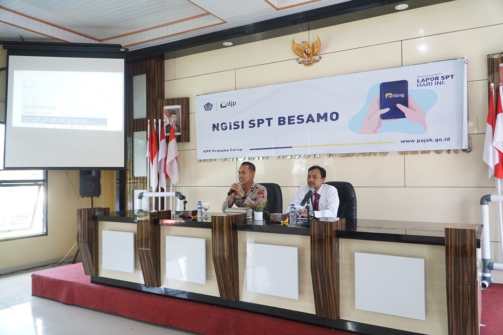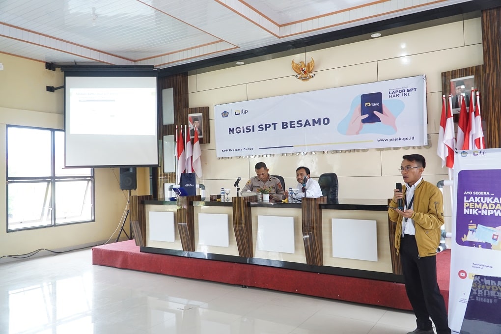 Kantor Pelayanan Pajak (KPP) Pratama Curup mengadakan kegiatan Ngisi Surat Pemberitahuan (SPT) Besamo bertempat di Aula Wira Pratama Kepolisian Resor (Polres) Rejang Lebong, Bengkulu (Senin, 13/02). Kegiatan Ngisi SPT Besamo dihadiri oleh 84 anggota Polres Rejang Lebong.