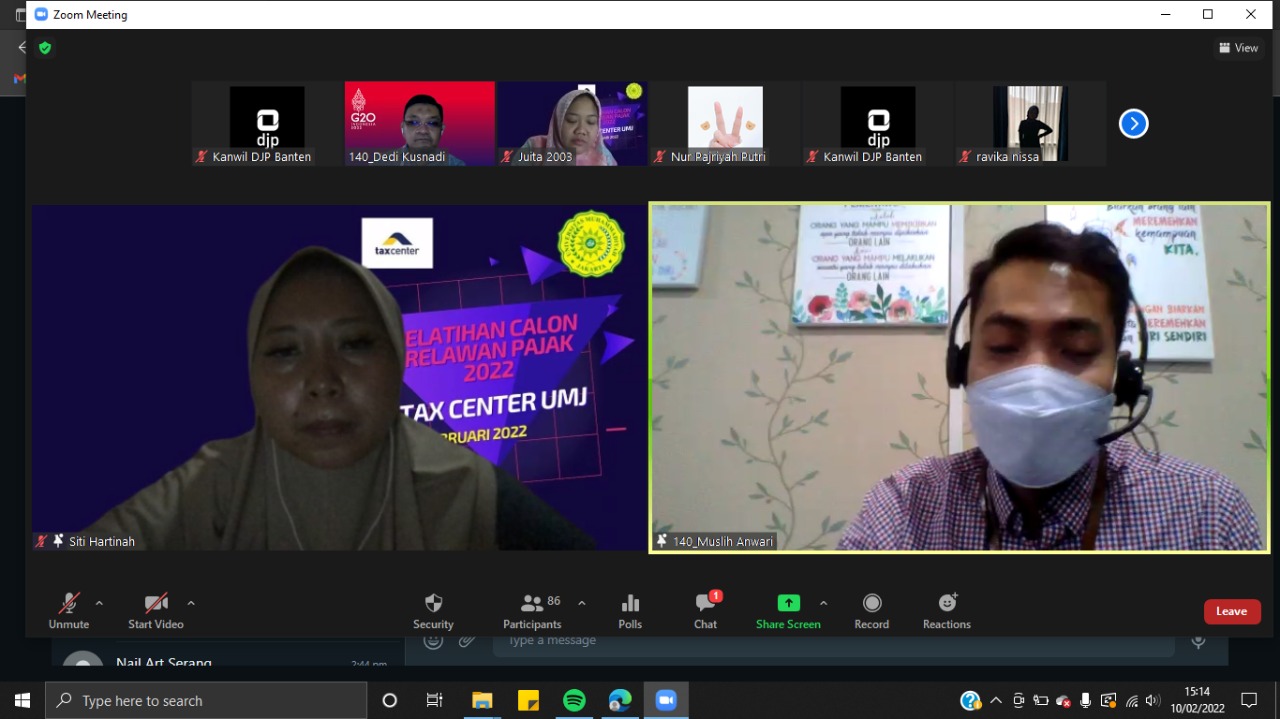 Kantor Wilayah DJP Banten bersama Tax Center Universitas Muhammadiyah Jakarta (UMJ) melakukan kegiatan pembekalan kepada relawan pajak secara daring melalui aplikasi zoom cloud meeting di Kota Serang, Banten (Kamis, 10/03).