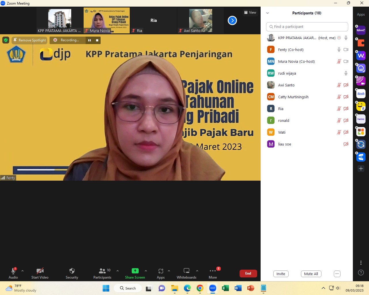 Kantor Pelayanan Pajak (KPP) Pratama Jakarta Penjaringan menyelenggarakan kelas pajak secara daring mengenai cara melaporkan SPT Tahunan PPh Orang Pribadi (Kamis, 9/3). Kegiatan dilaksanakan pukul 09.00 s.d. 11.00 WIB melalui Aplikasi Zoom dan diikuti sepuluh Wajib Pajak Orang Pribadi Non-PKP yang berdomisili di sekitar wilayah Penjaringan Jakarta Utara.