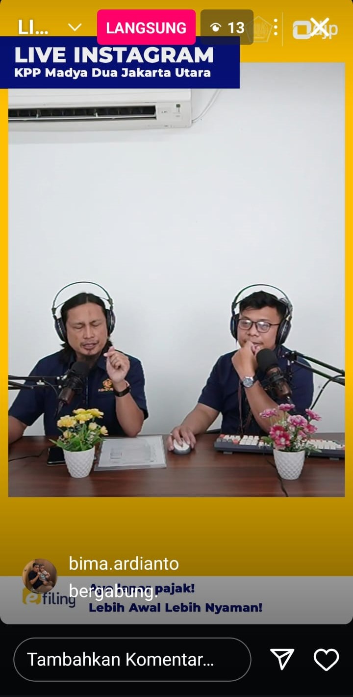 Kantor Pelayanan Pajak (KPP) Madya Dua Jakarta Utara kembali menggelar Instagram Live dengan mengangkat tema Pelaporan SPT Tahunan Orang Pribadi (Rabu, 26/3). Diselenggarakan secara langsung melalui akun Instagram resmi KPP Madya Dua Jakarta Utara @pajakmadyaduajakut pukul 11.00 hingga 12.00 WIB, Acara ini menghadirkan narasumber Angga Burhani Fajar, Fungsional Penyuluh Pajak KPP Madya Dua Jakarta Utara.