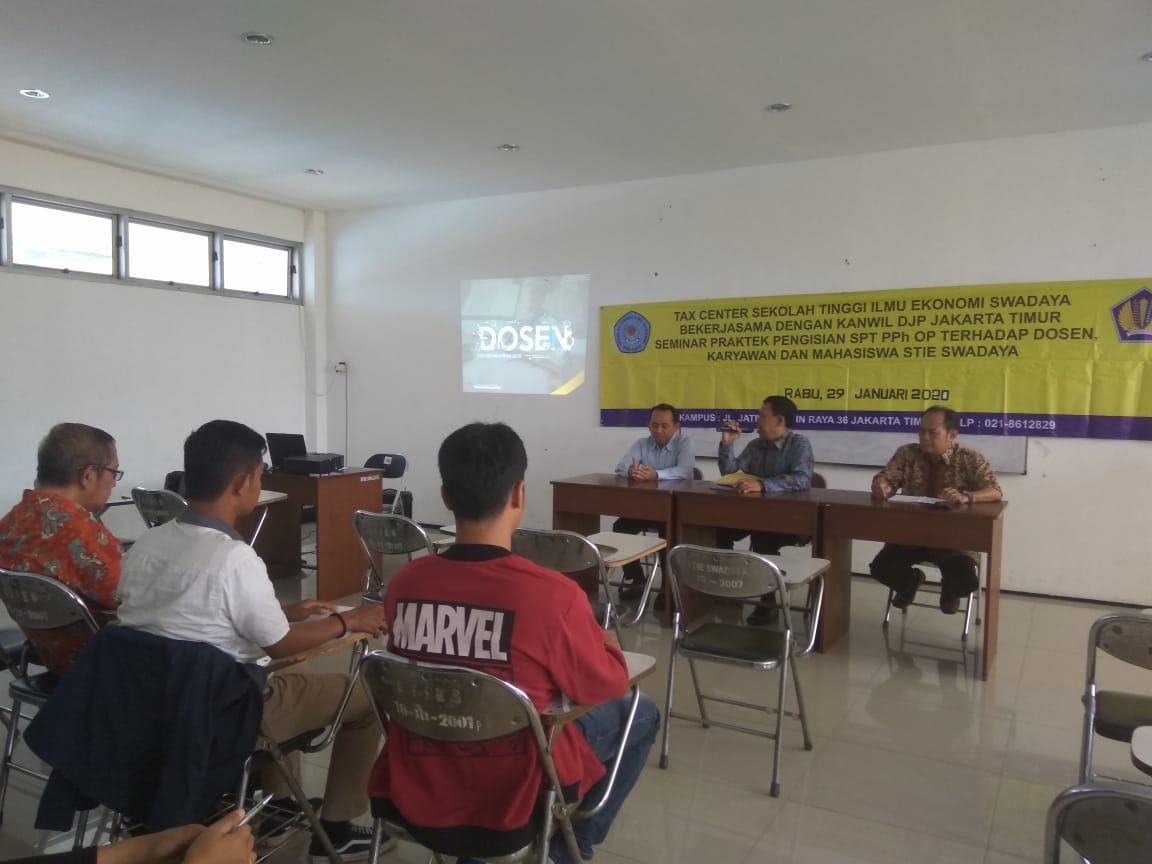Sekolah Tinggi Ilmu Ekonomi (STIE) Swadaya bekerja sama dengan Kantor Wilayah DJP Jakarta Timur menyelenggarakan sosialisasi perpajakan bagi dosen, karyawan, dan mahasiswa di Aula Kampus STIE Swadaya (Rabu, 29/1).