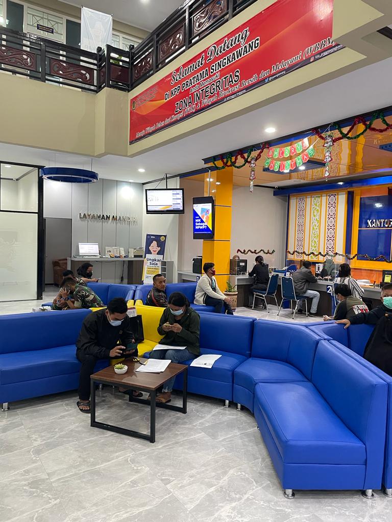 Wajib pajak (WP) di Kota Singkawang mulai melaporkan Surat Pemberitahuan (SPT) Tahunan tahun pajak 2021 secara langsung di Kantor Pelayanan Pajak (KPP) Pratama Singkawang, Singkawang (Selasa, 4/1). Banyaknya wajib pajak yang sudah mulai melaporkan SPT Tahunan membuat antrean di tempat pelayanan terpadu (TPT) KPP Pratama Singkawang melonjak.